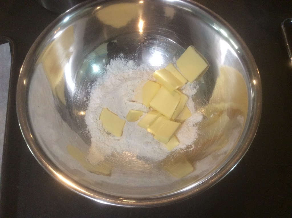 - In the medium size bowl, combine the flour, baking powder, and salt. Using the pastry cutter or fork, cut the butter into the flour until the mixture is unevenly crumbly. I left some larger bits of butter in the flour.