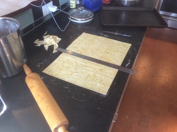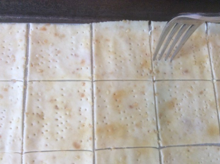 - Cut the dough into 1 1/4″ or 1 1/2″ or 2″ squares; I use a metal ruler and knife to mark out the spacing at the top and bottom and left and right sides. If I am making 1 1/2″ crackers, the bottom crackers are smaller and the ones on the right side are smaller. I lay the ruler on the dough so it aligns with the markings, and I cut the dough by following along the edge that aligns with the markings.
