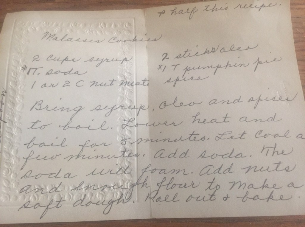 This is a recipe from my Great Aunt Hazel who was born in 1902. My sister found a card with the molasses cookie recipe and took pictures for us. I loved these cookies when I was a child. She made them any time we came to visit. It was magic to see the syrup foam when she added the baking soda!