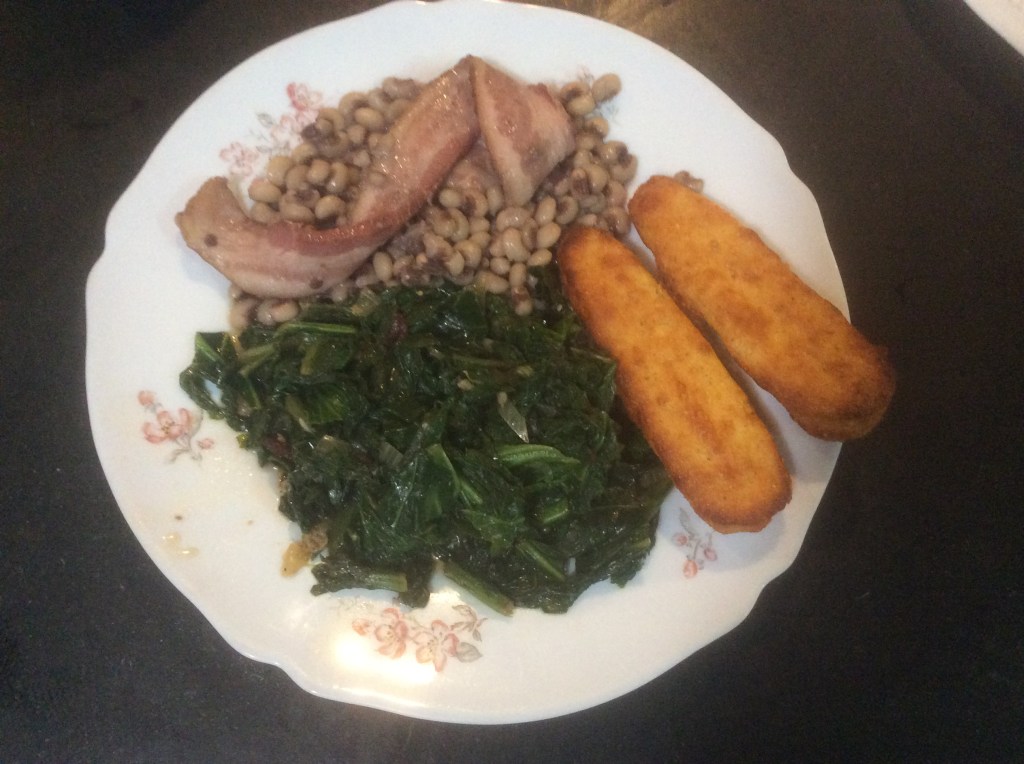 After all the rich food on New Year’s Eve, it feels good to eat simple traditional food today. My Aunt Hazel always said that black-eyed peas meant silver and my grandmother claimed they were for luck. Both agreed that greens meant dollars. And if you are eating greens, you need to have cornbread.