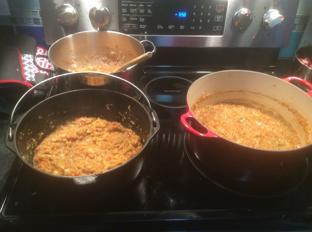 I have been cooking since 10 am today and I finished at 9:30 pm. I did take a 30 minute lunch break. I made three batches of gumbo, two batches of red bean, four king cakes, four loaves of New Orleans style bread, and 24 boiled eggs for stuffed eggs.