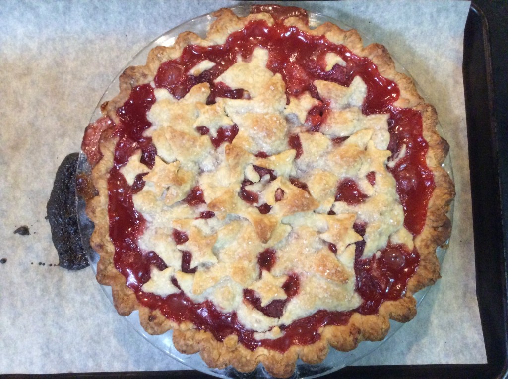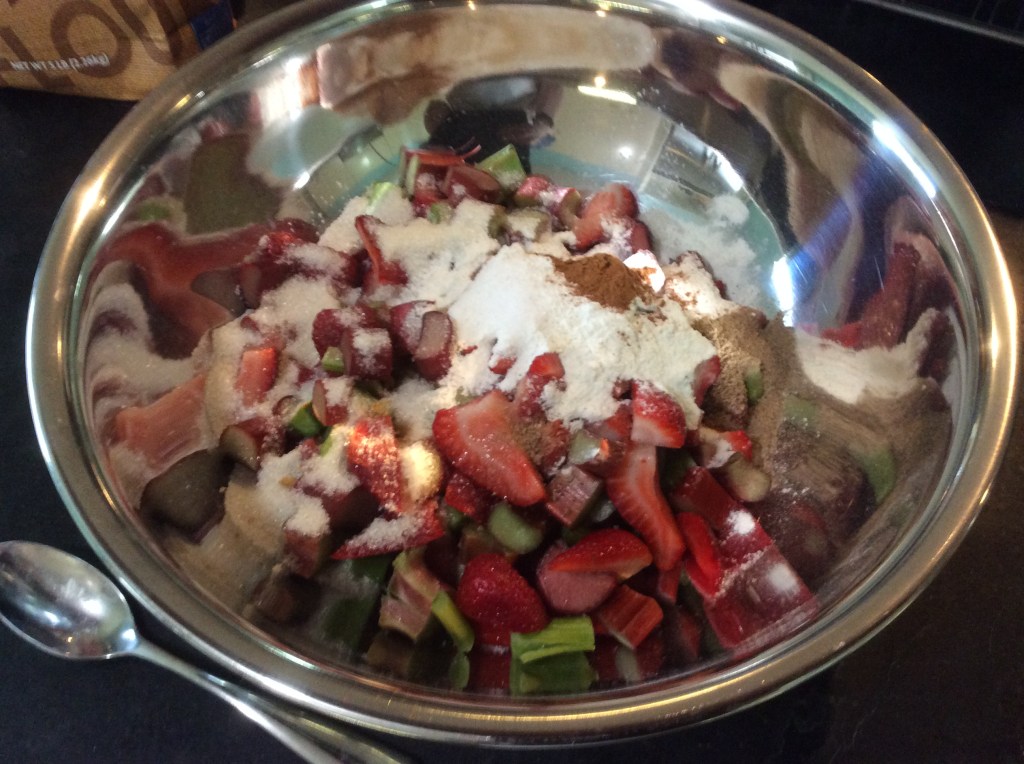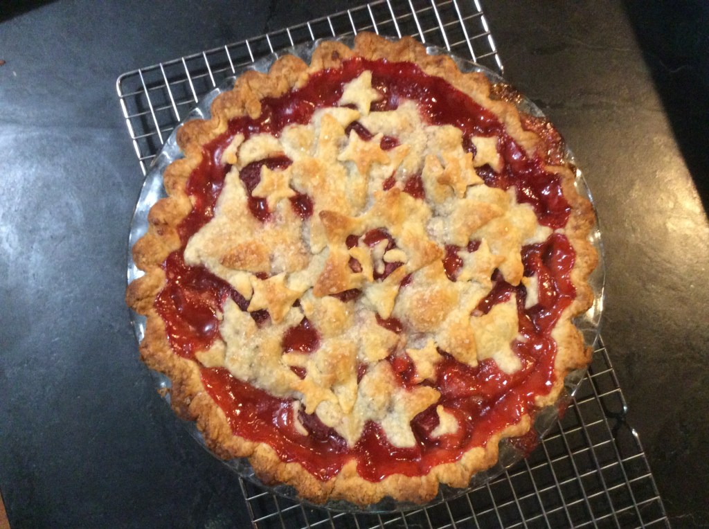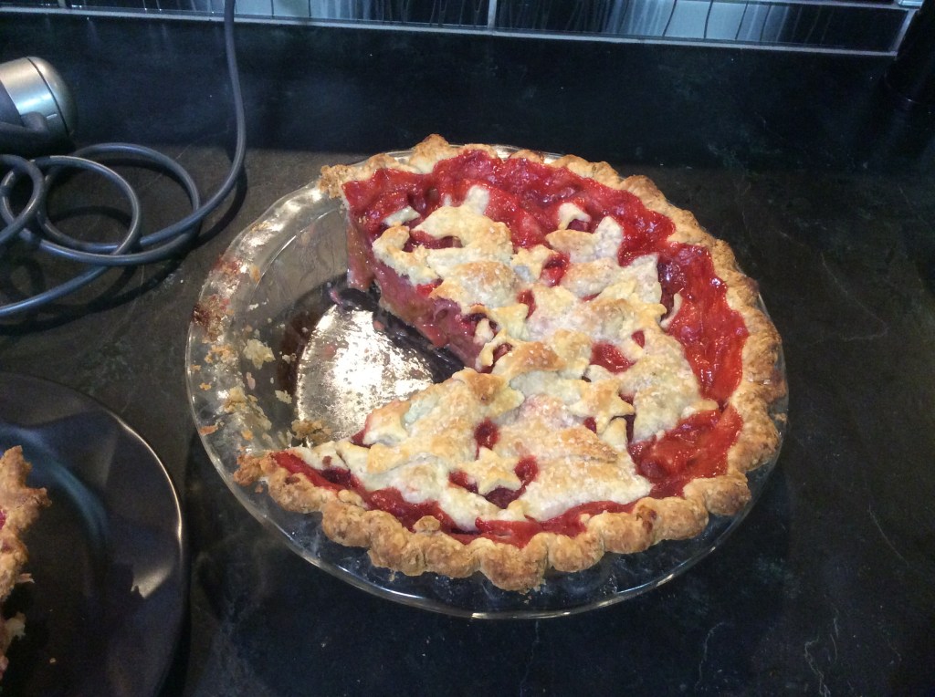 Yesterday, after work, I made a strawberry rhubarb pie with star cutouts for the top crust. The cooked version was not nearly as pretty as the raw version. The rhubarb is freshly harvested from my garden and the strawberries are from Costco. I like using cardamom, as well as cinnamon and a little bit of nutmeg and mace.