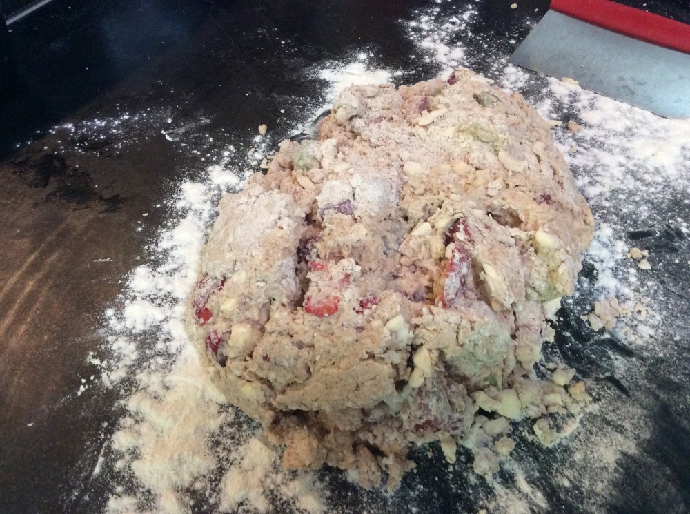 - Lightly dust the counter with flour, turn the mixture out onto it, then give it a final toss. Divide it into 2 even piles, gathering each into a mound, then very briefly knead each mound; it’s fine if the mixture is still somewhat crumbly.