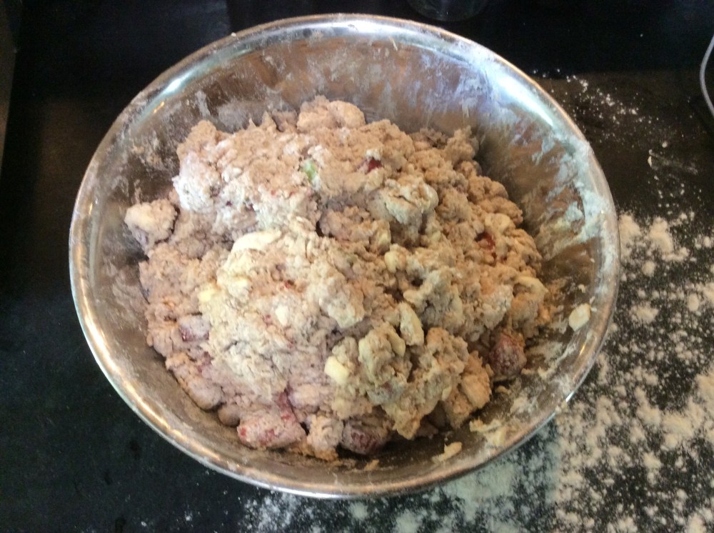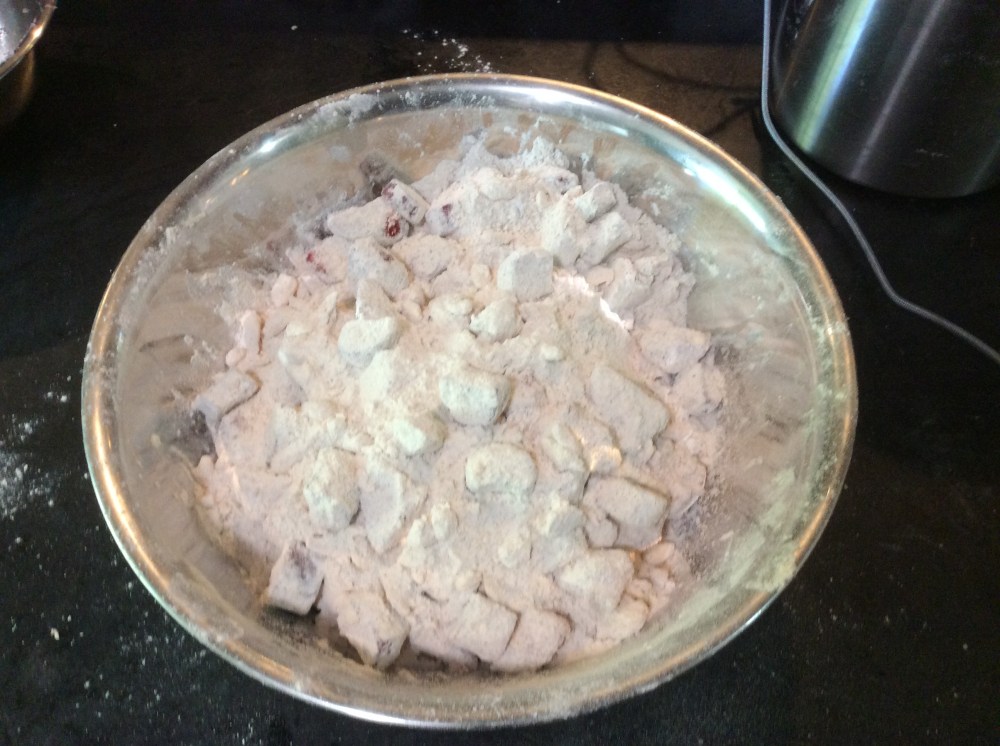 - Add the remaining buttermilk in 2 more additions, tossing after each. After the final addition of buttermilk, toss until no dry, floury bits remain. The mixture will be quite crumbly and will not form a cohesive dough.
