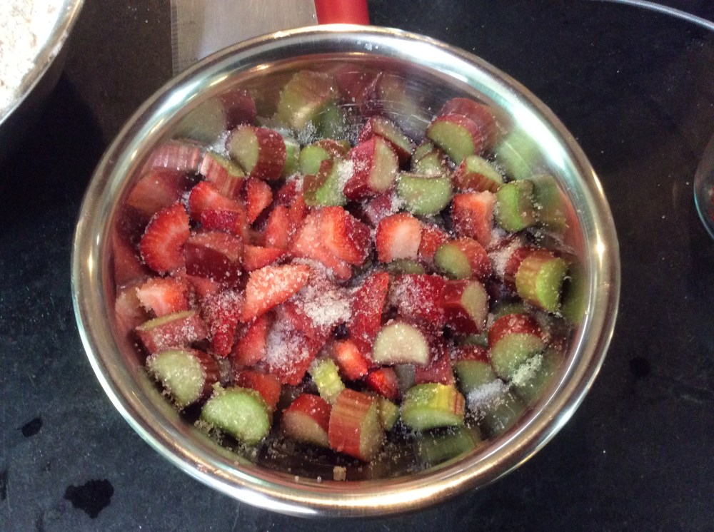 - In a medium bowl, combine the strawberries and rhubarb with the 1/4 cup of sugar.