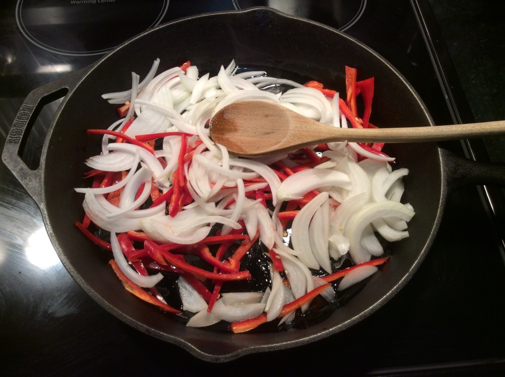 - Either remove the onion and bell pepper or move them to one side of the skillet. (I moved mine to one side of the skillet.)