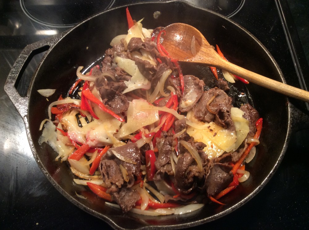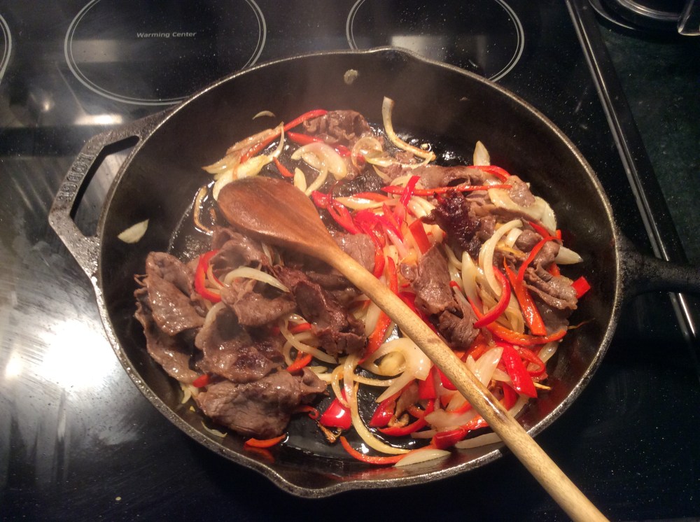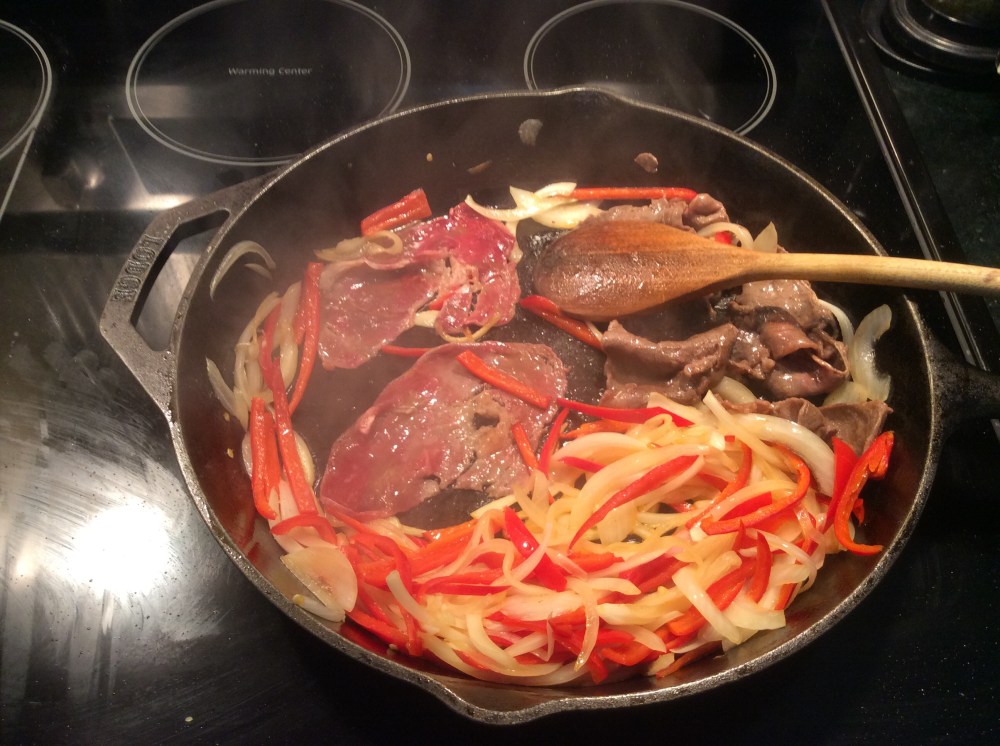 - Add three to four slices of the steak and as soon as it is brown on the skillet side, turn it and cook until brown on the second side. Move the steak to the side with the onion and bell pepper, or remove it from the skillet. Repeat until all the steak is used up.