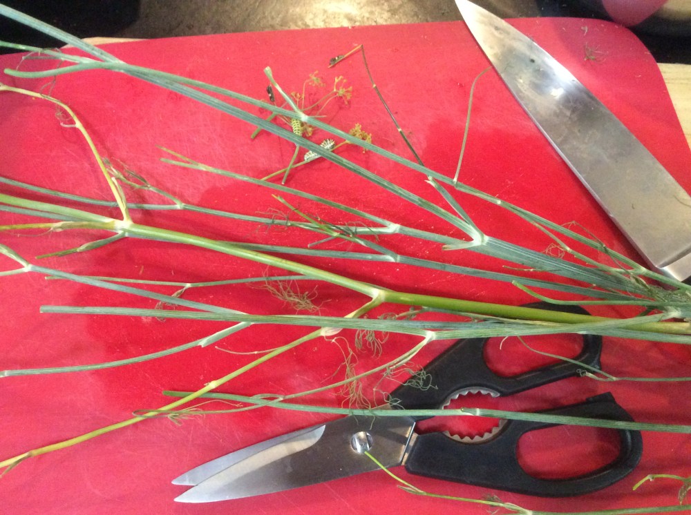 - Strip the fronds from the dill stalks and cut the flowers of the tops off the stalks and save them. Wash the fronds and flowers.