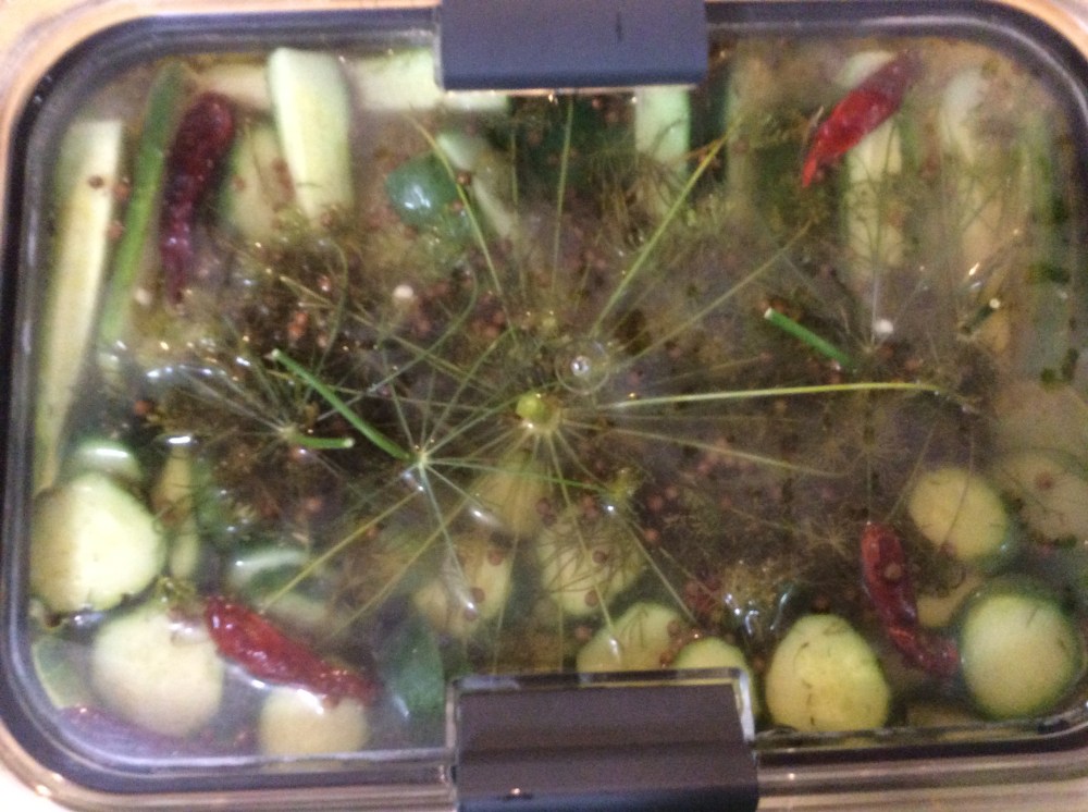 - Put the 8 dried red peppers in the container with the cucumbers.