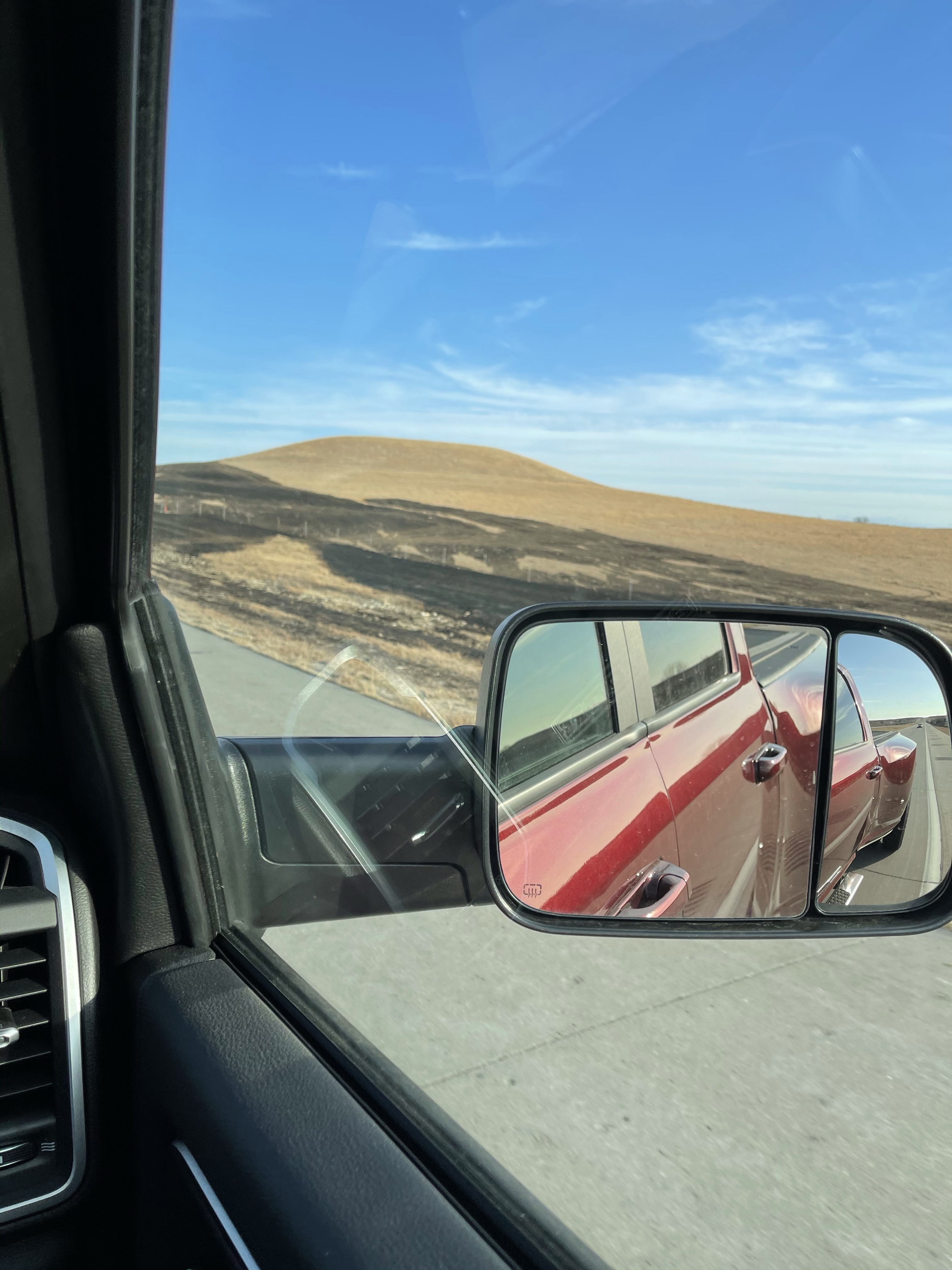 We are now in eastern Kansas. We have had two mishaps so far. A robin flew into the front of the truck and didn’t make it. The backend of the truck cover popped up. It made some noise and it looks bent. Bruce was able to bend it back.