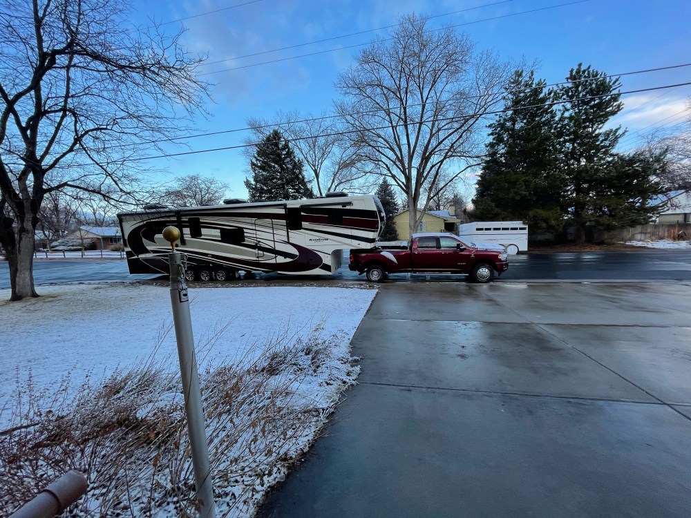 This morning, I woke up to a light snow and I took some pictures of Cliff the Big Red Truck and the RV out in the snow.