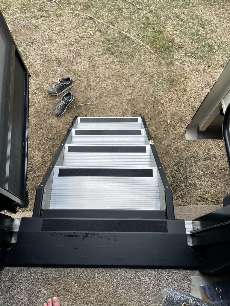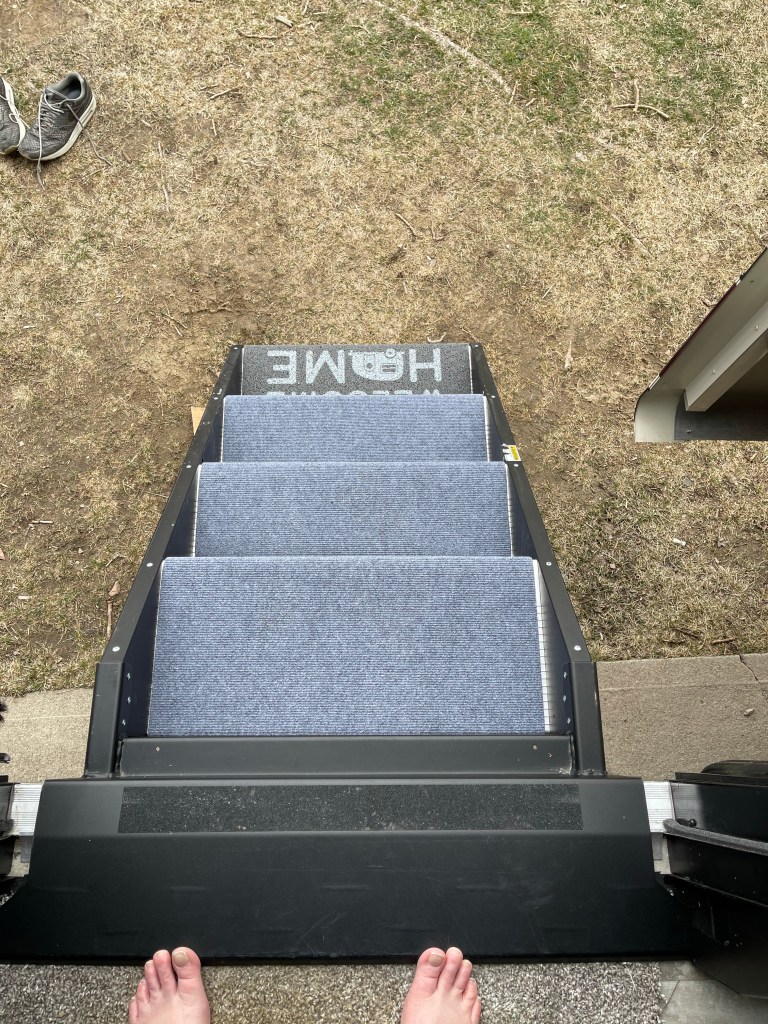 On Sunday afternoon (March 28), we headed over to the RV. After unloading the truck, Bruce took Nox for a walk while I put things away. After everything was put away, I decided to put the carpet covers on the steps.