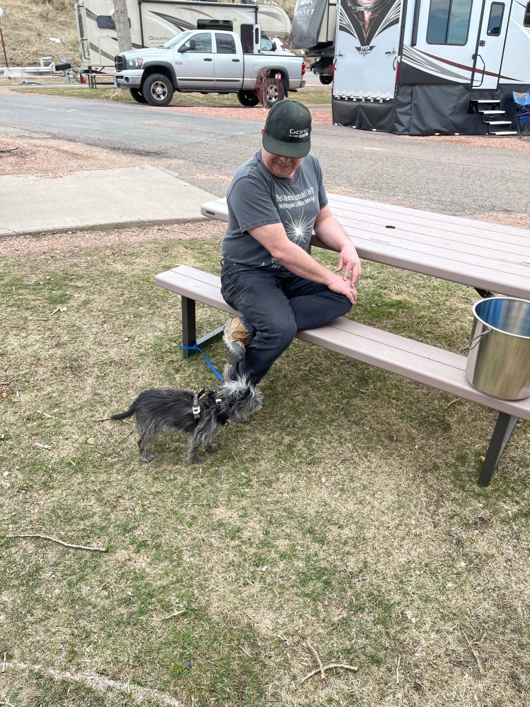 Once the steps were clean, I unwrapped the mat cover and wrapped it around the top step. I was getting ready to put the next cover on when Bruce arrived back at the RV with Nox. Bruce tied Nox’s leash to the picnic table. Bruce sat at the picnic table and talked to me about the step coverings. (He didn’t stay seated long.)