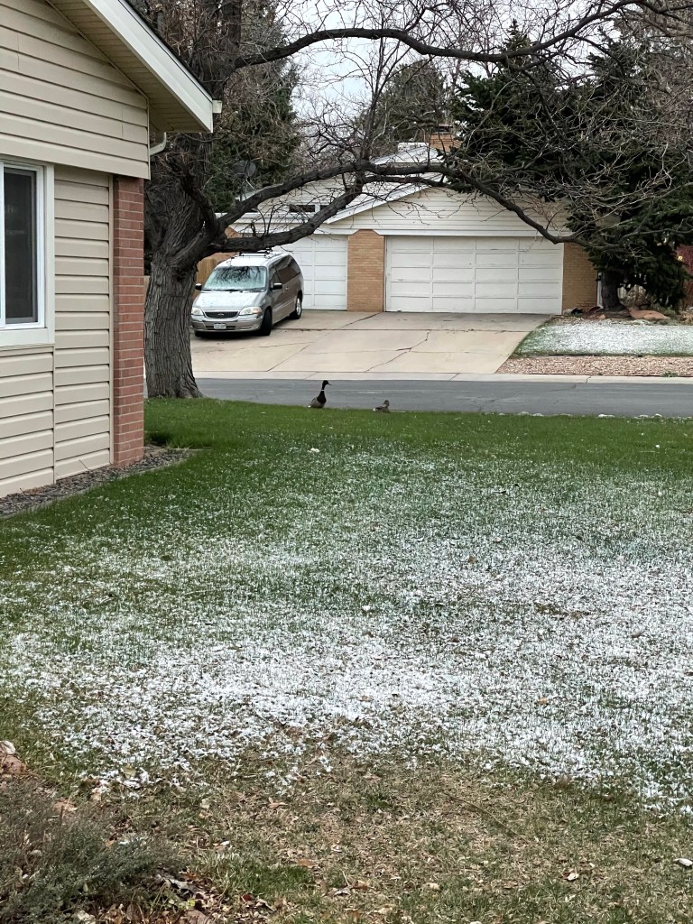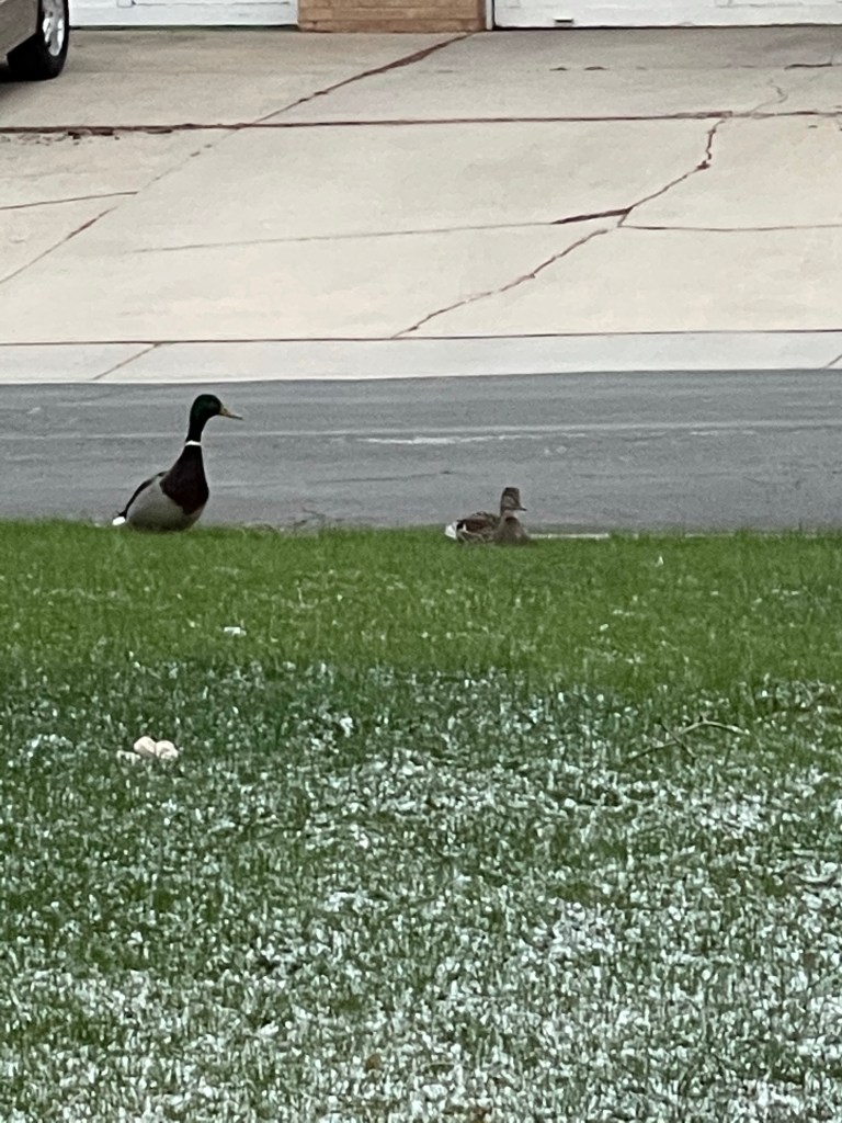 As we drove up to the house around 6:30 AM this morning, we saw a couple of ducks landing in the yard. The white in the pictures is a light dusting of snow.