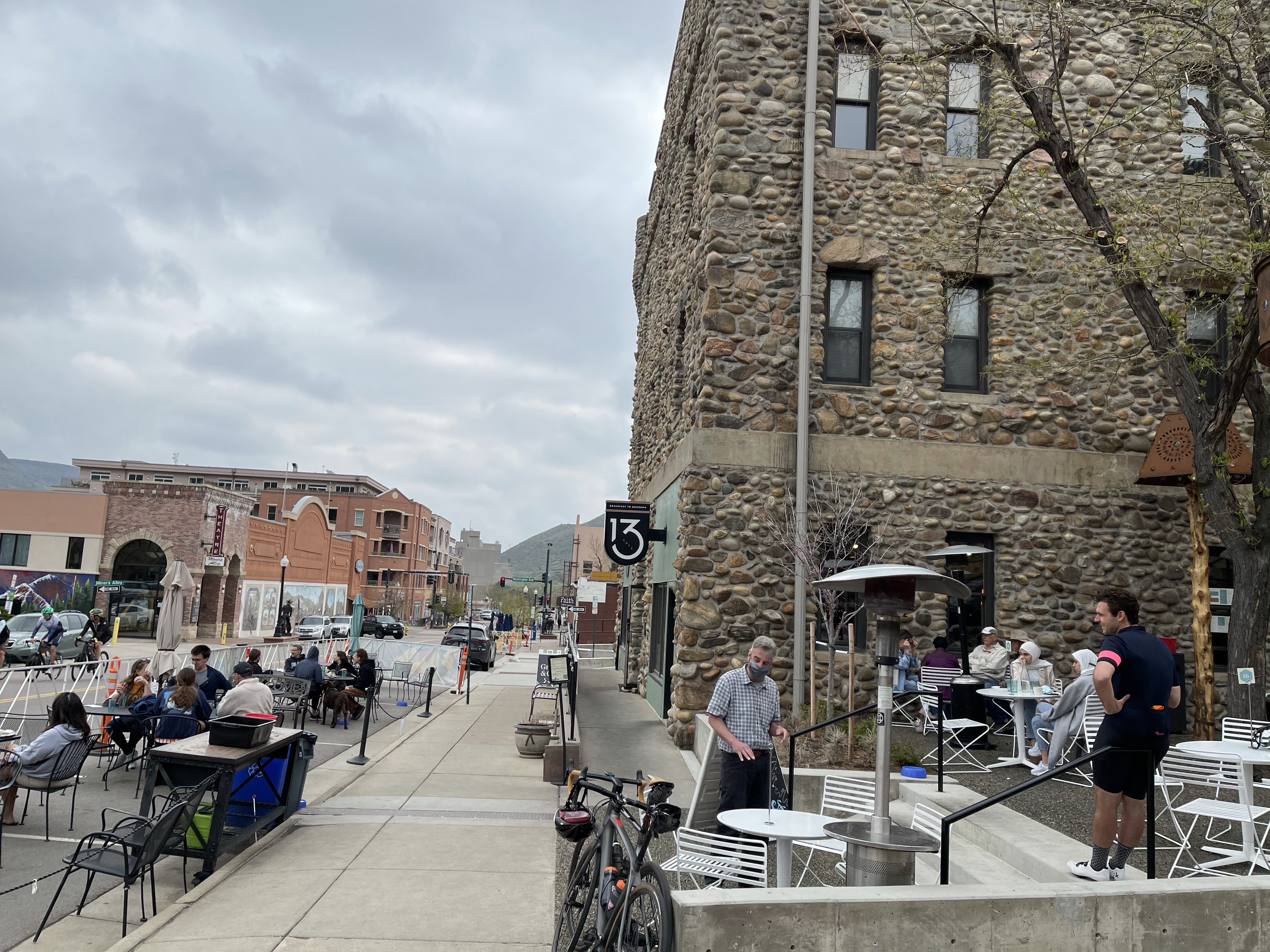 We dropped Nox off at the RV. We drove into Golden and parked by Clear Creek. We admired the flowers in the yard as we walked to the restaurant. We treated ourselves to breakfast at Cafe 13. We sat outside in the slightly foggy 52 degrees F weather. We wore our jacket while eating.