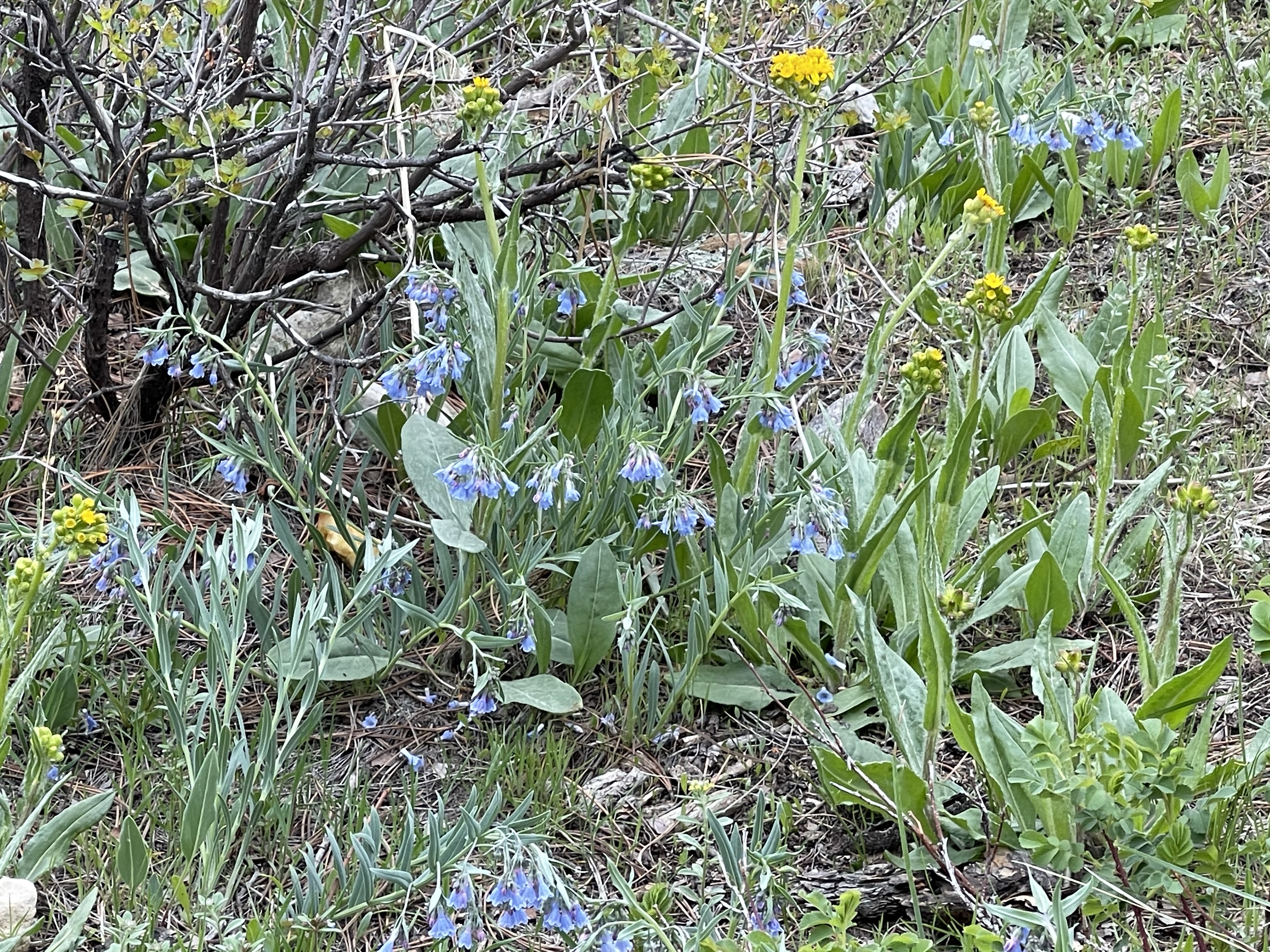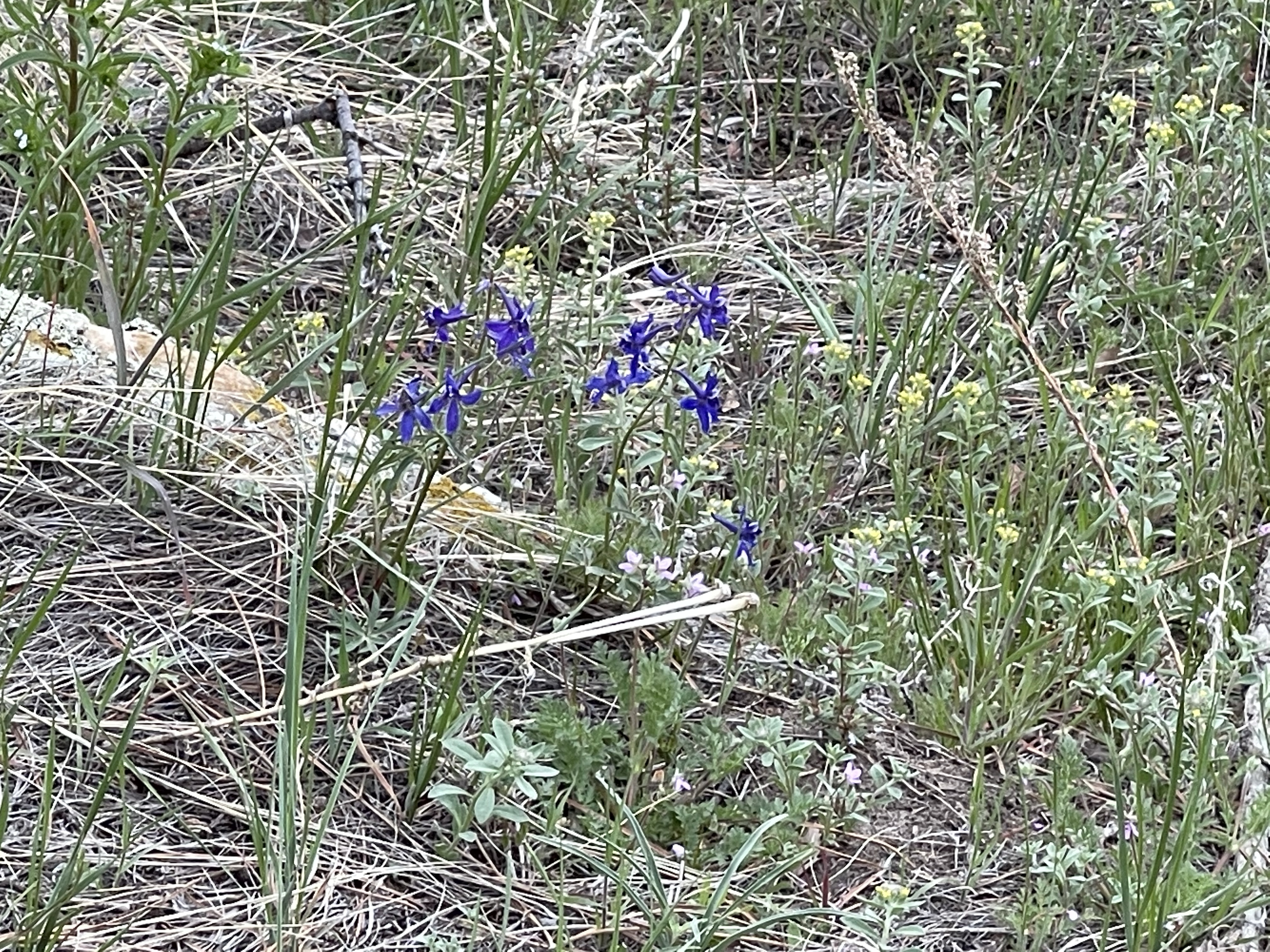 This morning, Bruce and I took Nox for a longer hike. We walked from the Dakota Ridge RV Park to the Tin Cup Hogback Park, which is to the south of the RV park. We walked to the hiking trail, Stegosaurus Ridge. We got some great views and lots of wildflowers were blooming.