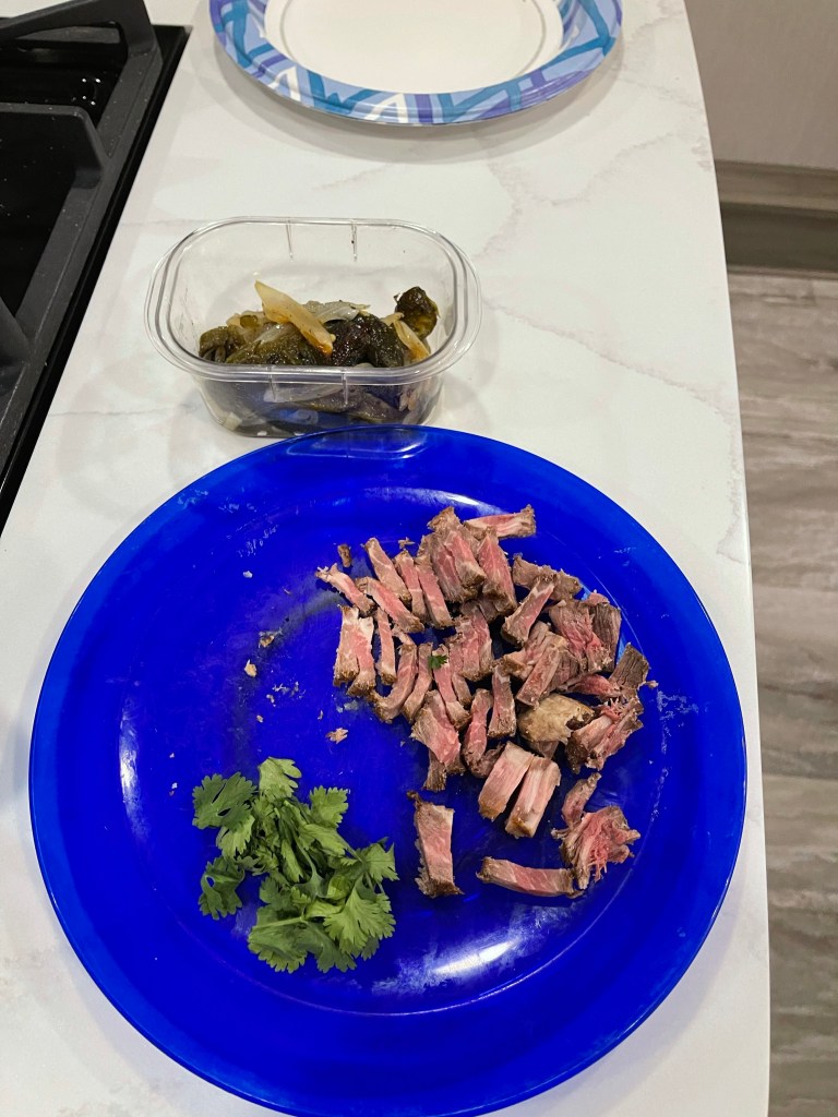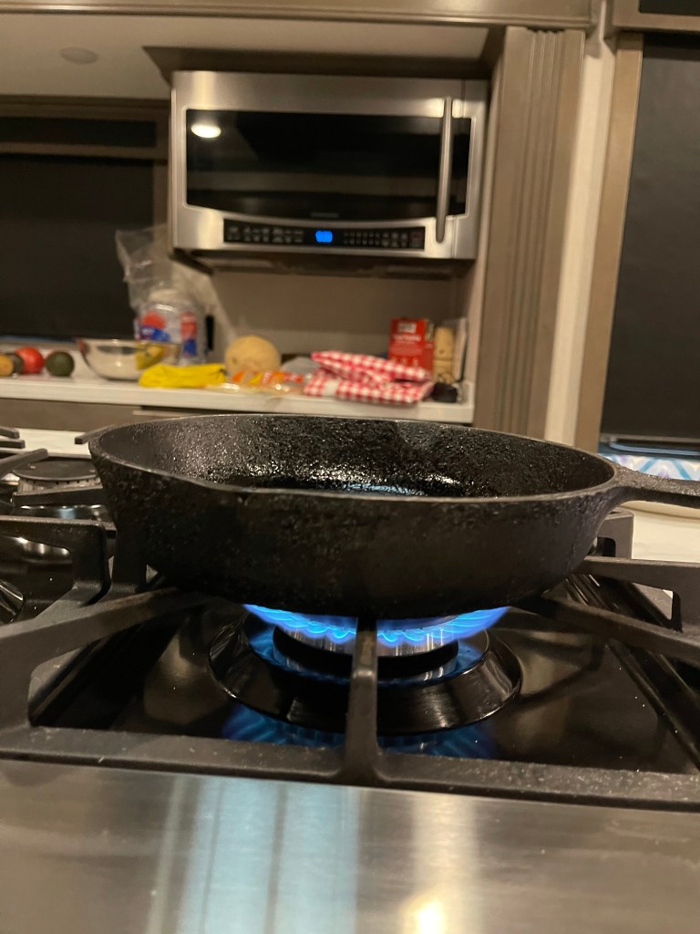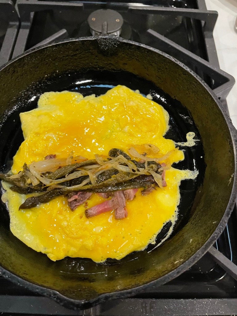 Saturday, on my grill at the RV, I made steak fajitas using strip steak, roasted poblano peppers, and grilled marinated onions. I had leftovers. On Sunday morning, Bruce asked, “what do you want to do for breakfast?” and I suggested an omelet. He was happy with that idea, so I used the fajita leftovers to make an omelet for him.