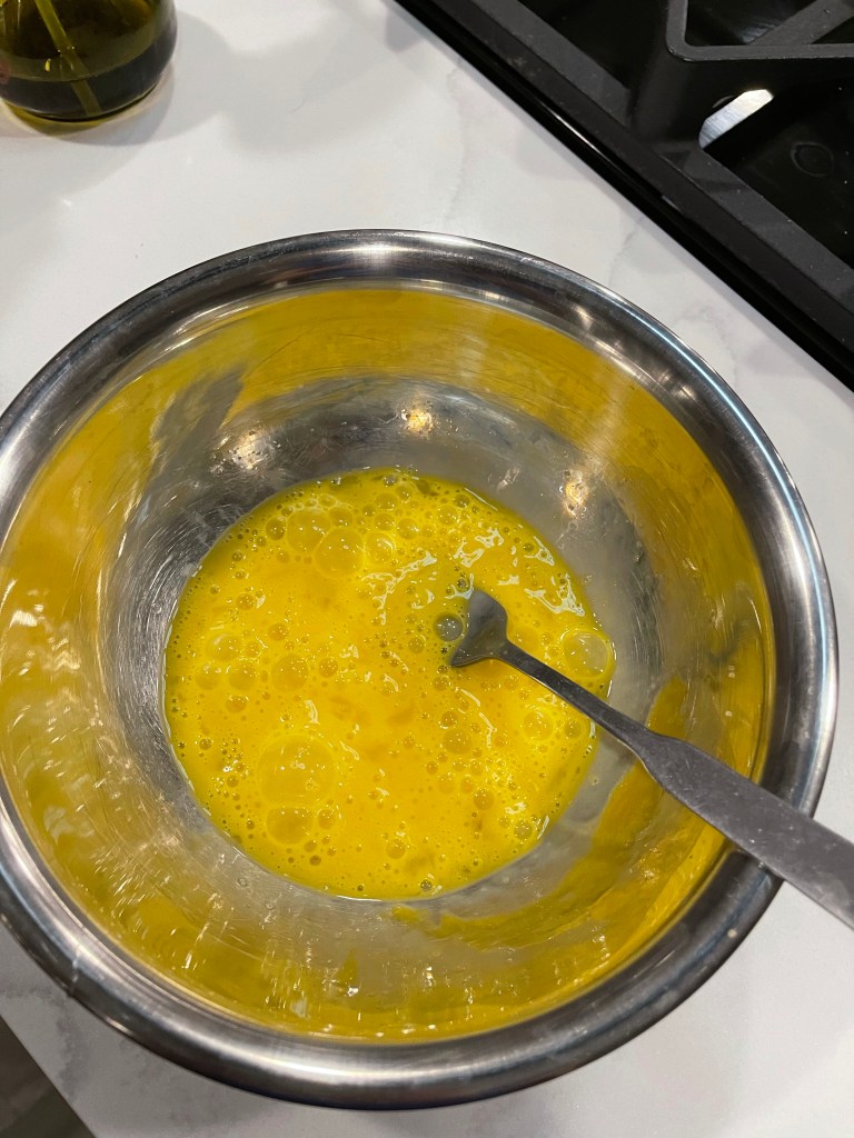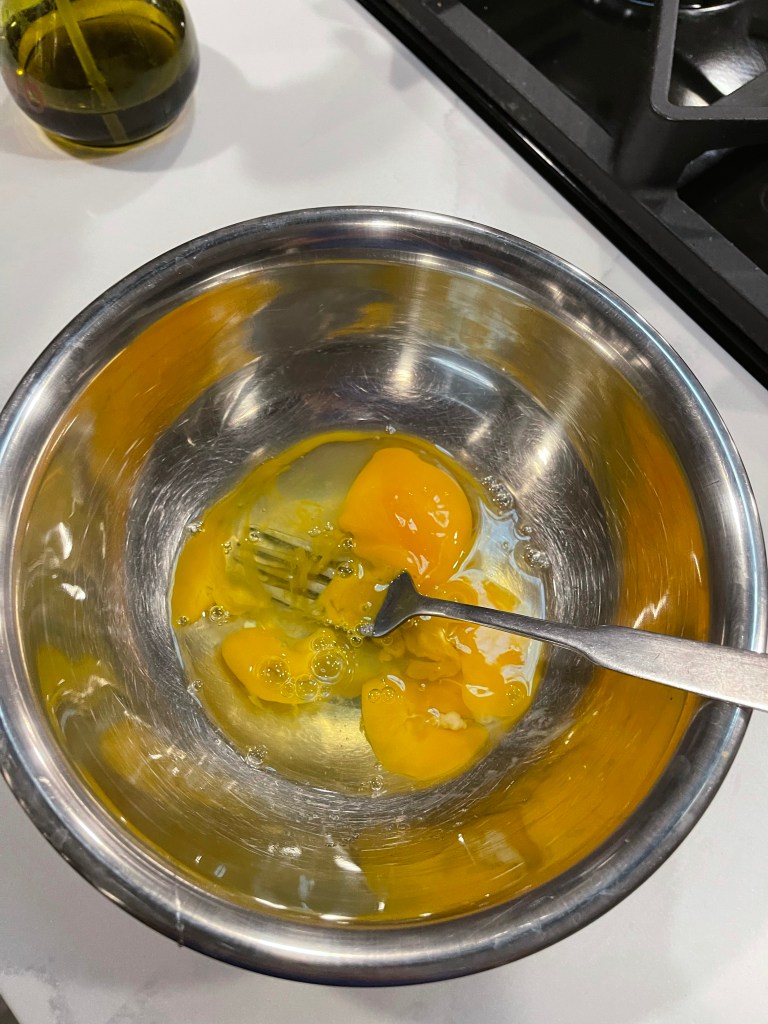 - Crack the two eggs into the medium size bowl and break the yokes with your fork. Add at least a pinch of salt or more to taste.