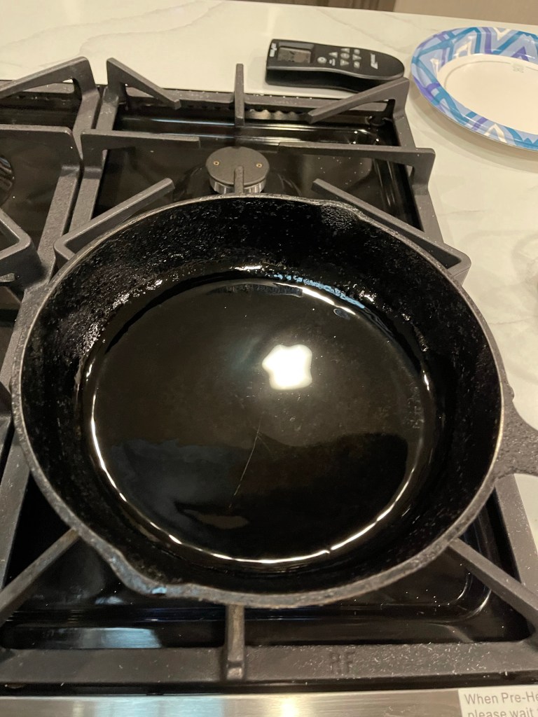 - The pan should be hot with hot oil in at this time.