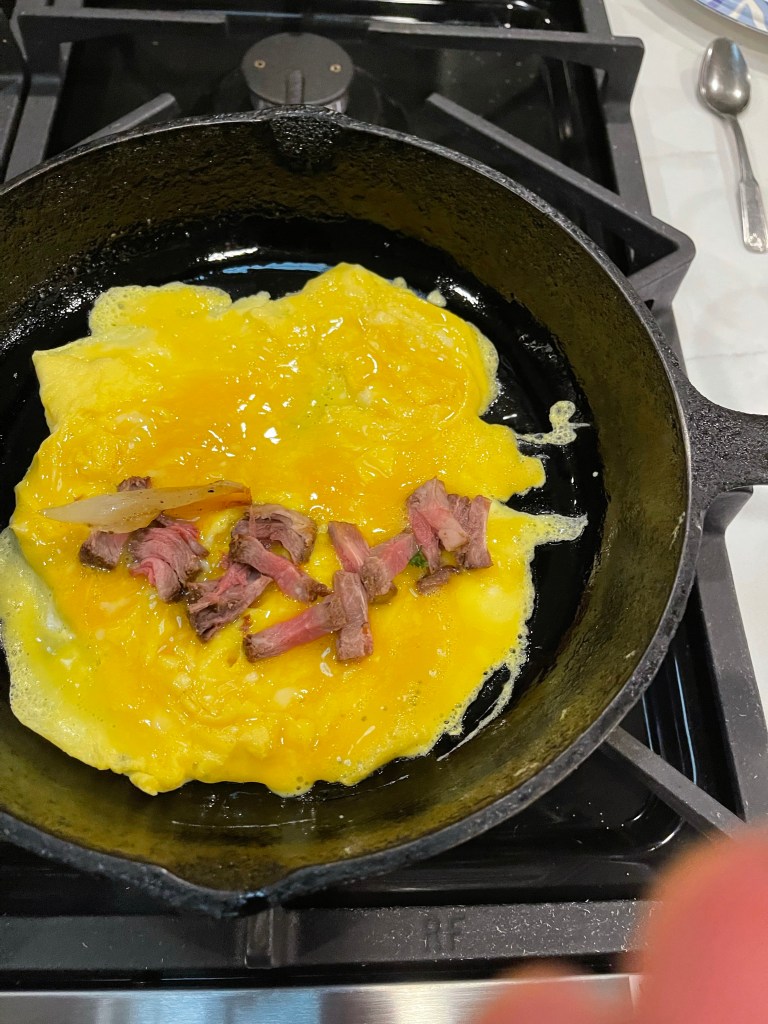 - Across the eggs in the middle of the pan, add the sliced steak, grilled onions and peppers.