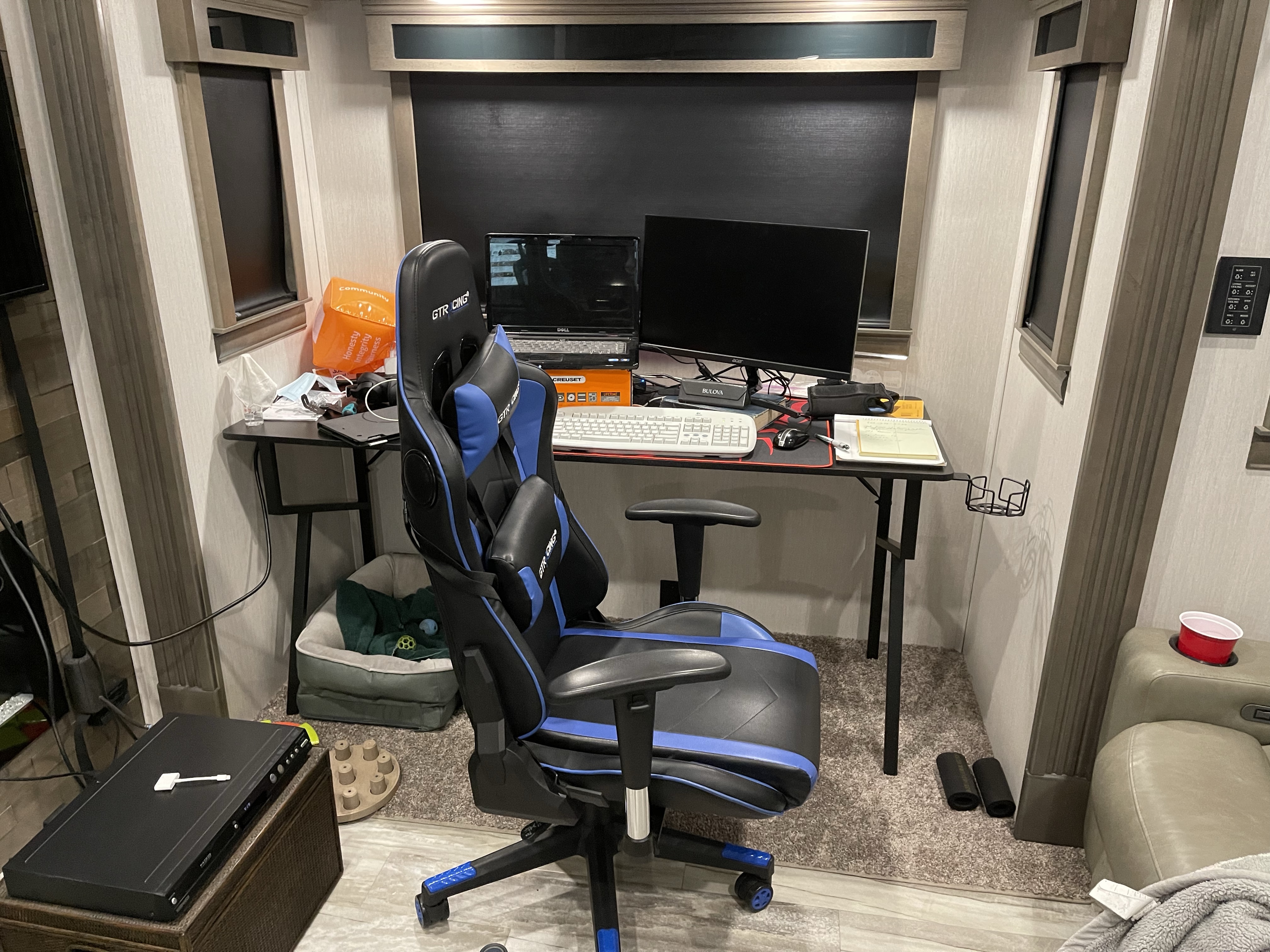 Our plan was to put another desk in the RV in the empty slide. In the meantime, we turned the empty slide into Nox’s space.