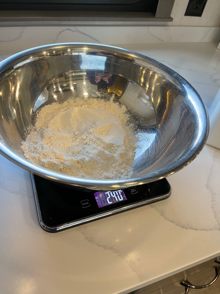 - Whisk the flour, salt, and baking powder together in the medium size bowl.