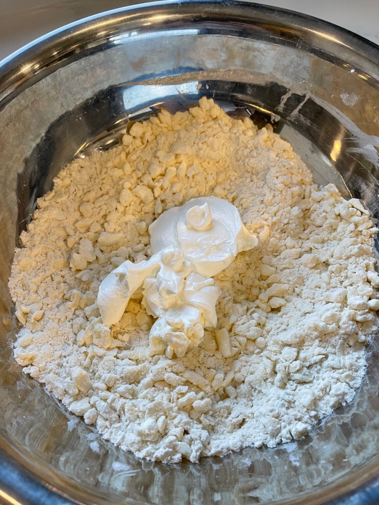 - Turn the mixture out onto a floured work surface, and bring it together with a few quick kneads. You will have a very shaggy dough. If it doesn’t come together, add a teaspoon of sour cream and knead, you may have to add another teaspoon of sour cream and knead to get the dough to come together.