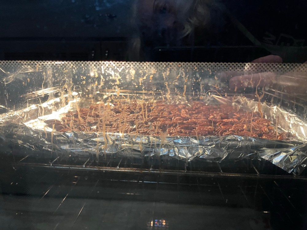 - Remove the sheet from the oven and set it aside to allow the pecans to cool.