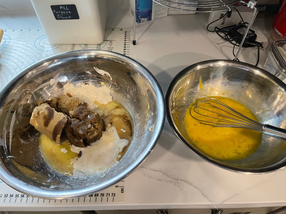 - In the order listed, combine the melted butter, maple syrup, brown sugar, vanilla, salt, flour, and milk in a medium size bowl and mix with the whisk.
