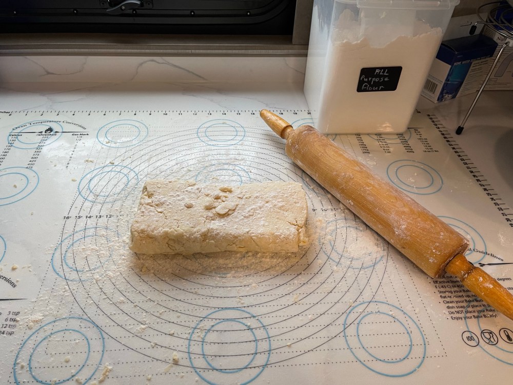 - Pat the dough into a rough log, and using the rolling pin, roll it into an 8″ x 10″ rectangle. Dust both sides of the dough with flour, and starting with a shorter end (8″), fold it in three like a business letter.(fold 1/3 of the way across, then take the remaining dough and fold it over the folded dough.)