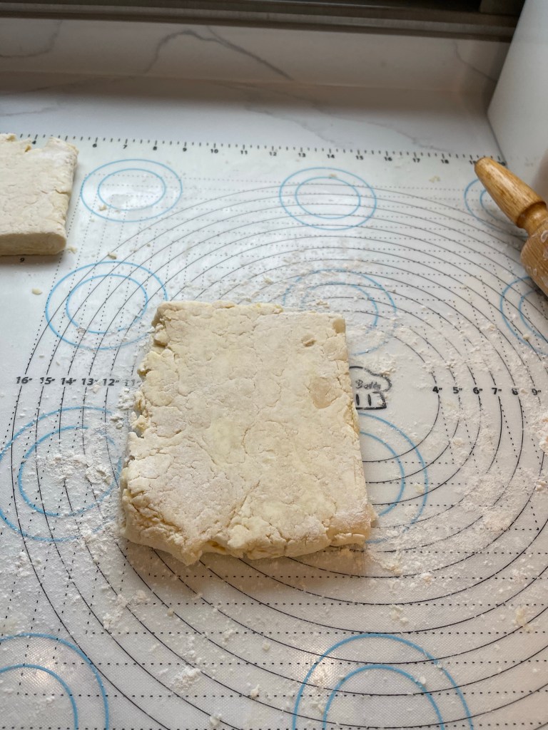 - Cut the dough rectangle in half, so that you have two 5″ squares.