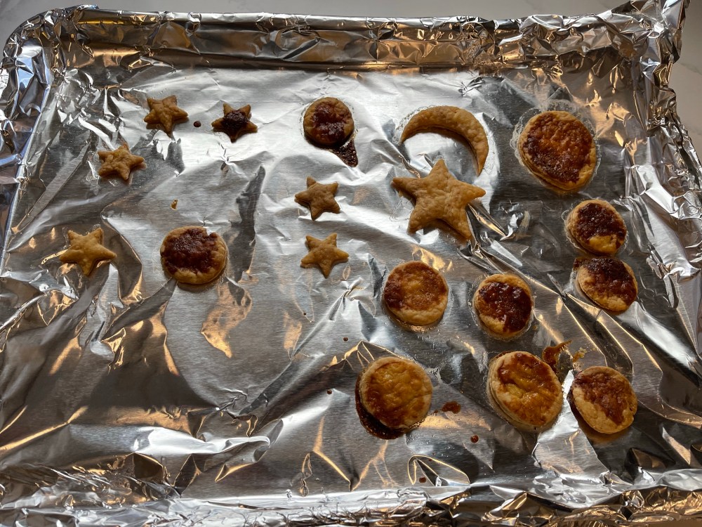 1 or 2 rimmed baking sheet(s), 1 deep dish pie pan or 2 regular pie pans, whisk, microwave proof small bowl or a small pot, 2 medium size bowl, rolling pin, enough aluminum foil to cover the rimmed baking sheet(s), pastry cutter, knife, cooling rack, small cookie cutters