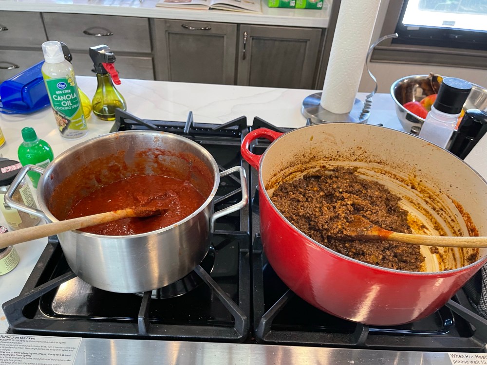 2. When the oil starts to shimmer, add the ground beef and pork to the pot. Stir occasionally until the meat no longer has any pink.