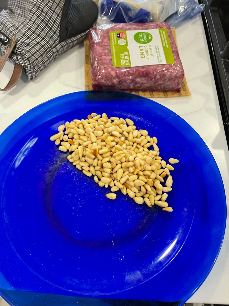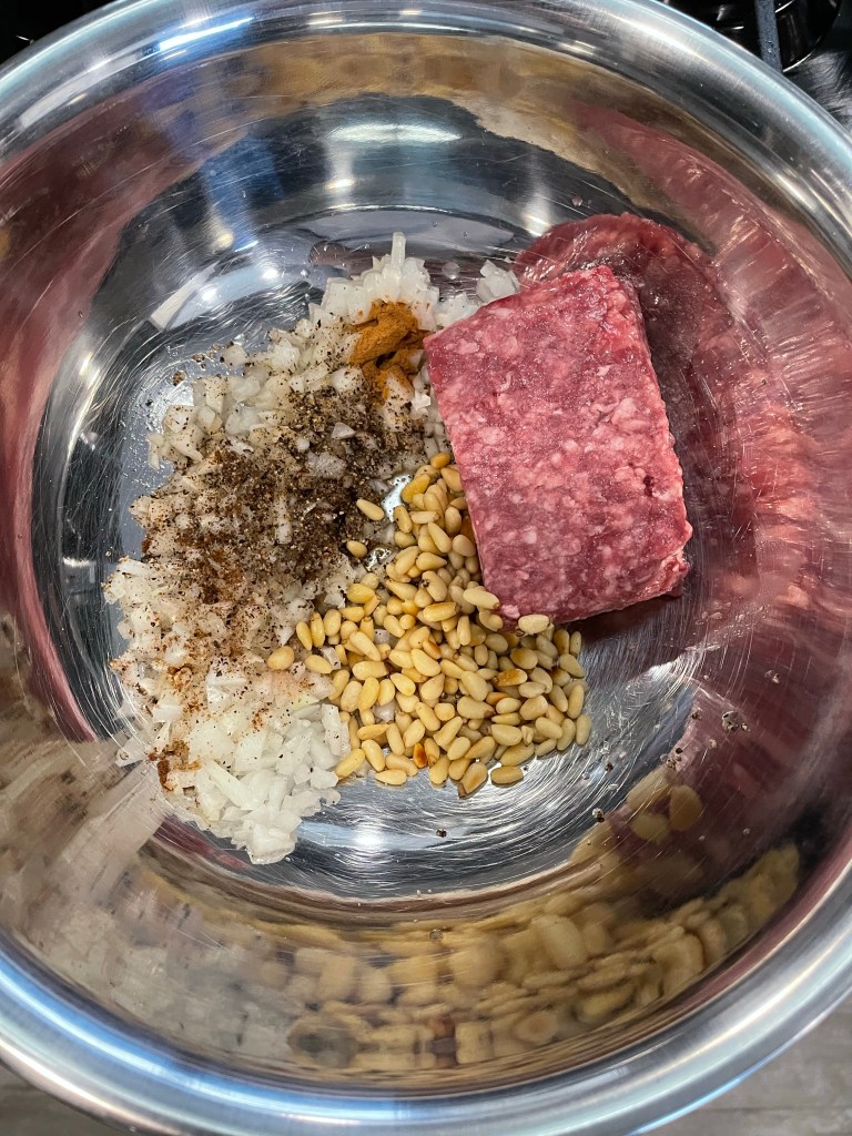 - Once pine nuts have cooled down, warm to the touch, mix all the meat filling ingredients together.