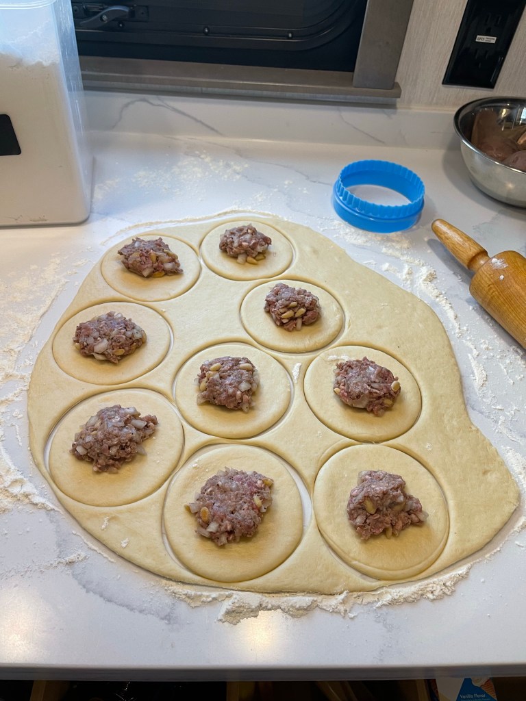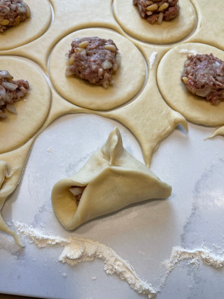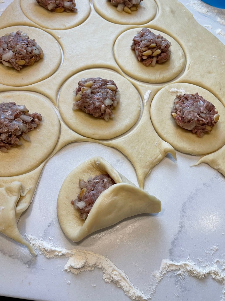 - Place a heaping tablespoon of filling in the center of each circle of dough. “Be careful not to let the filling touch the edges of the dough where it will be gathered together and closed. A good way to keep the filling in the center is to lower the spoon with the filling over the center of the dough (parallel to it) and use your fingers to slide the filling off the spoon and into the center of the dough circle—or just use your fingers and no spoon.”