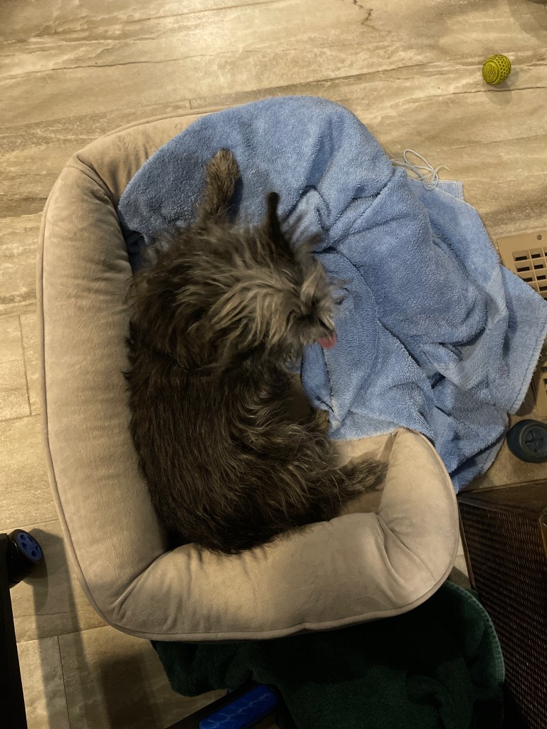 Nox got toweled dry after I helped get the snow clumps from her belly and leg hairs. She wanted to play for a bit, so we threw her balls and told her to put Kong on end. She had a great time and then she was ready to rest. She lay down in her bed and went to sleep and stared snoring. I reached down to per her and woke her up.