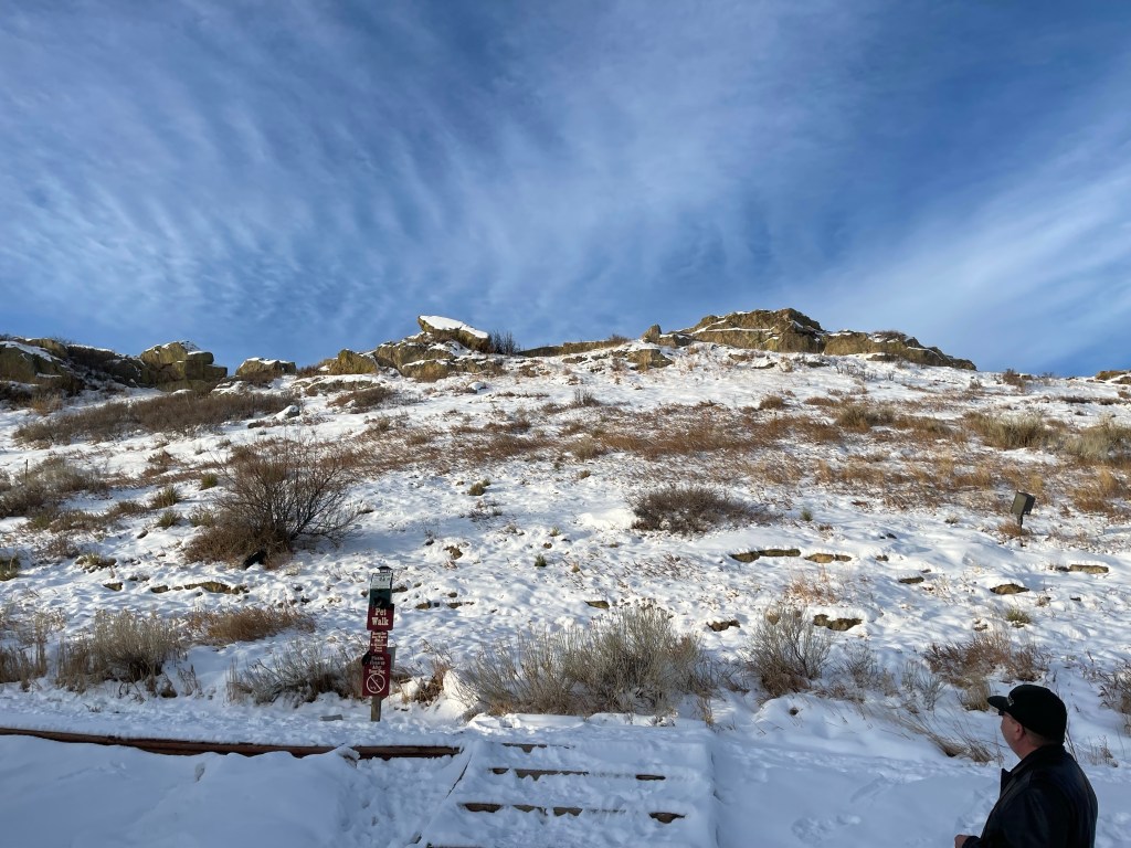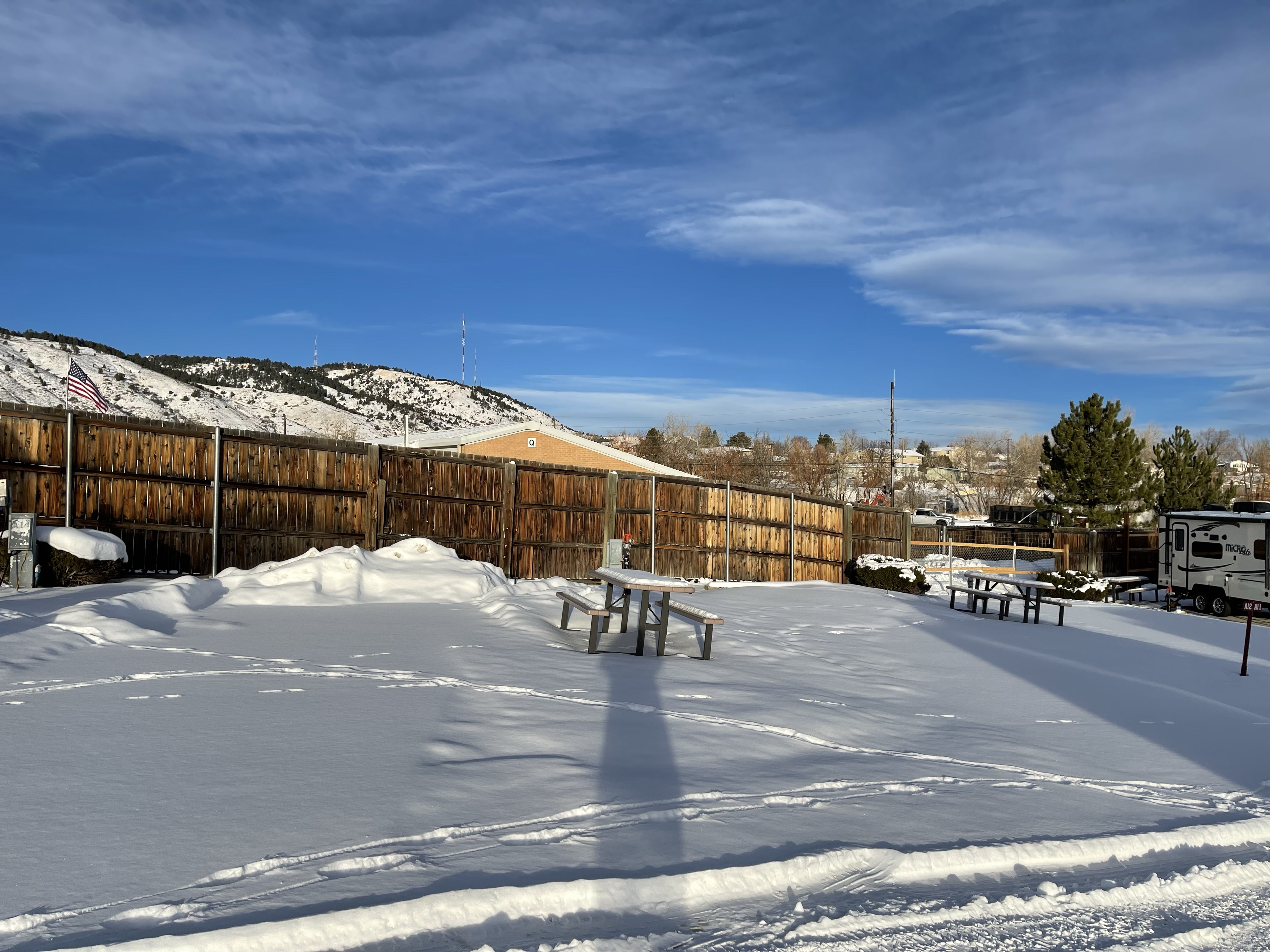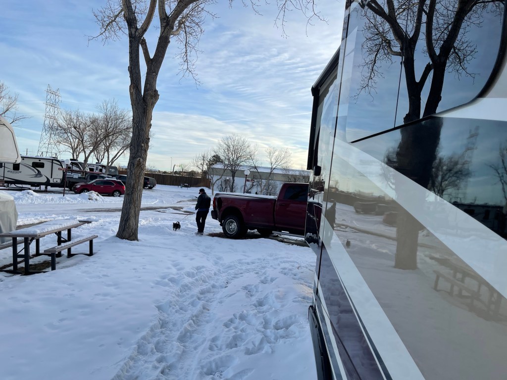 When we got back to the RV, we used a brush to get the snow off our shoes. I took a picture of the the long icicle by the door.