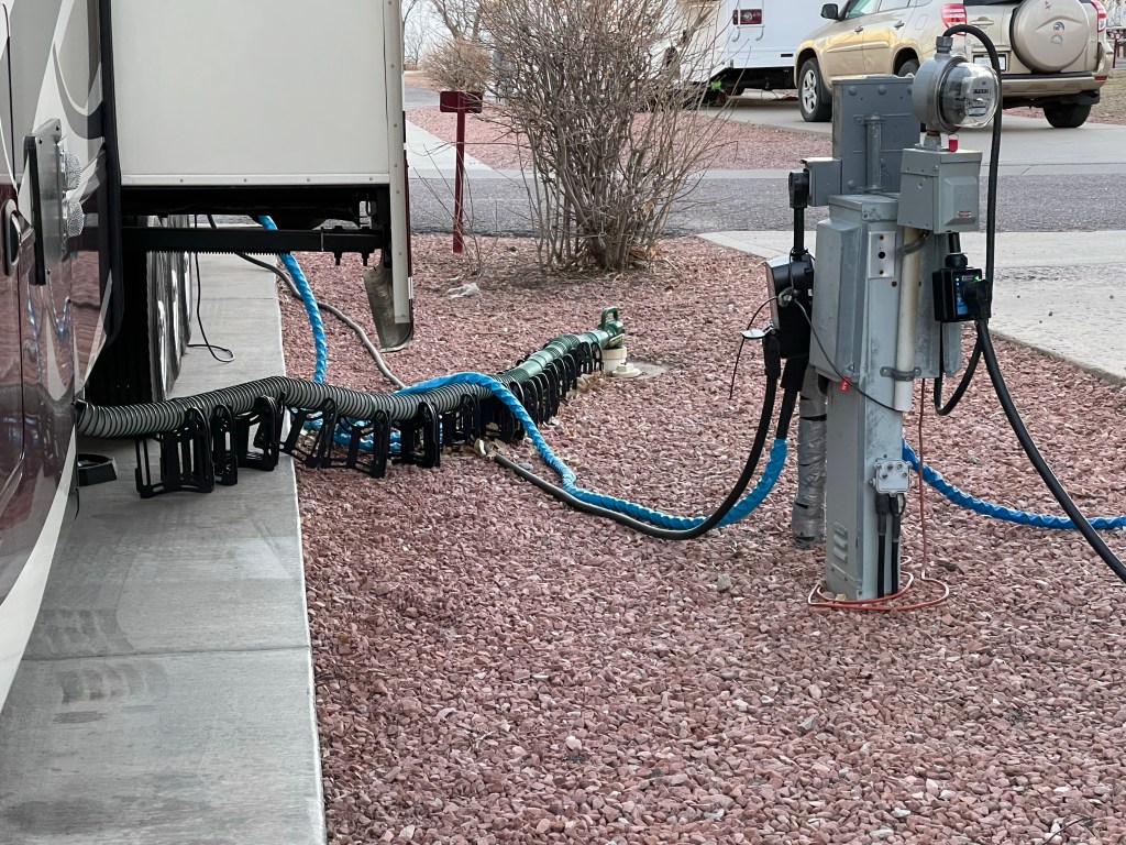 We did need to buy a sewer hose support. We looked at them at Camping World and compared the prices to Amazon prices. Amazon was cheaper, so back in March of 2021, I purchased the Camcorder 20 feet Sidewinder RV Sewer Hose Support.