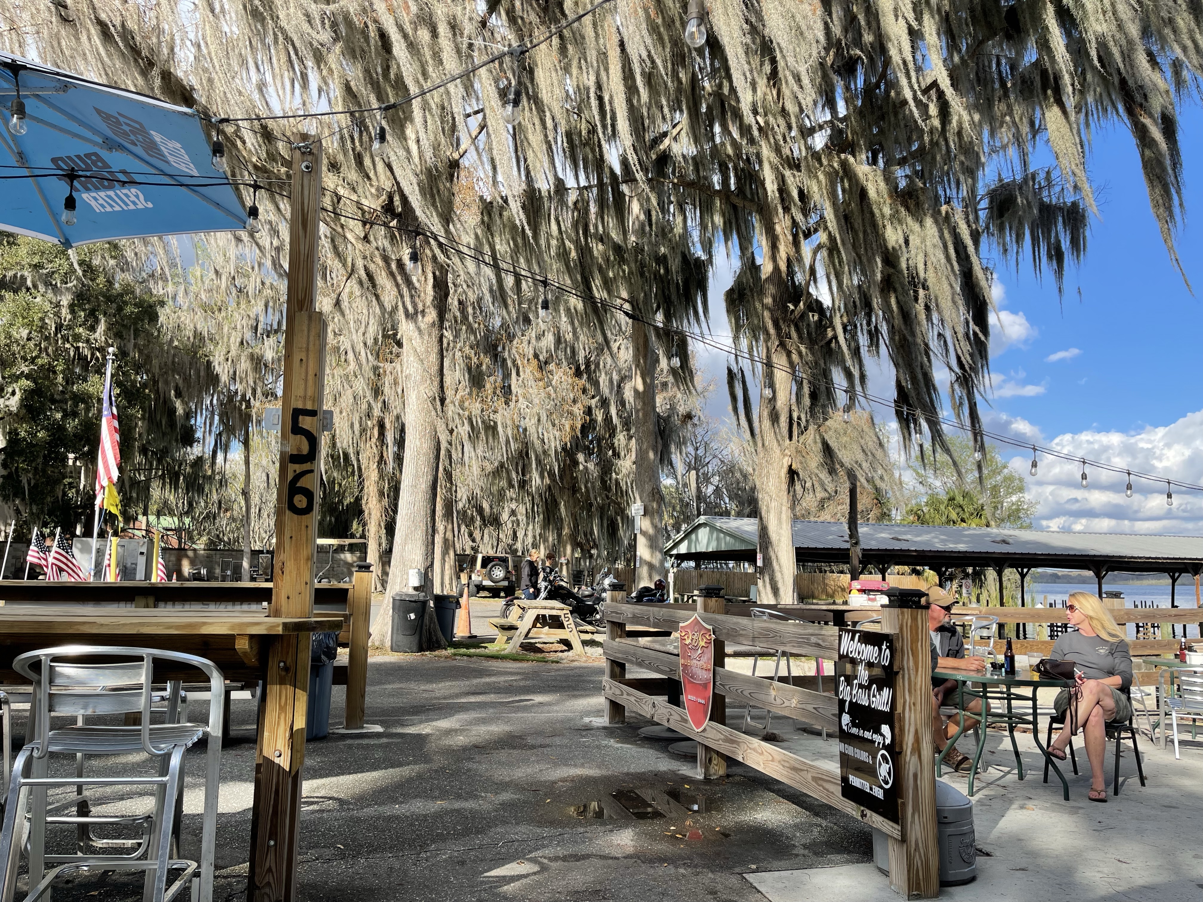 On Sunday, we rode to Big Bass Grill Lakefront Restaurant and Marina. It is mostly outside with uncovered and covered seating. They had live music, a bluegrass banjo player. He was good and we enjoyed listening to him while we waited. The scenery is beautiful. They were out of the food we wanted, so we left.
