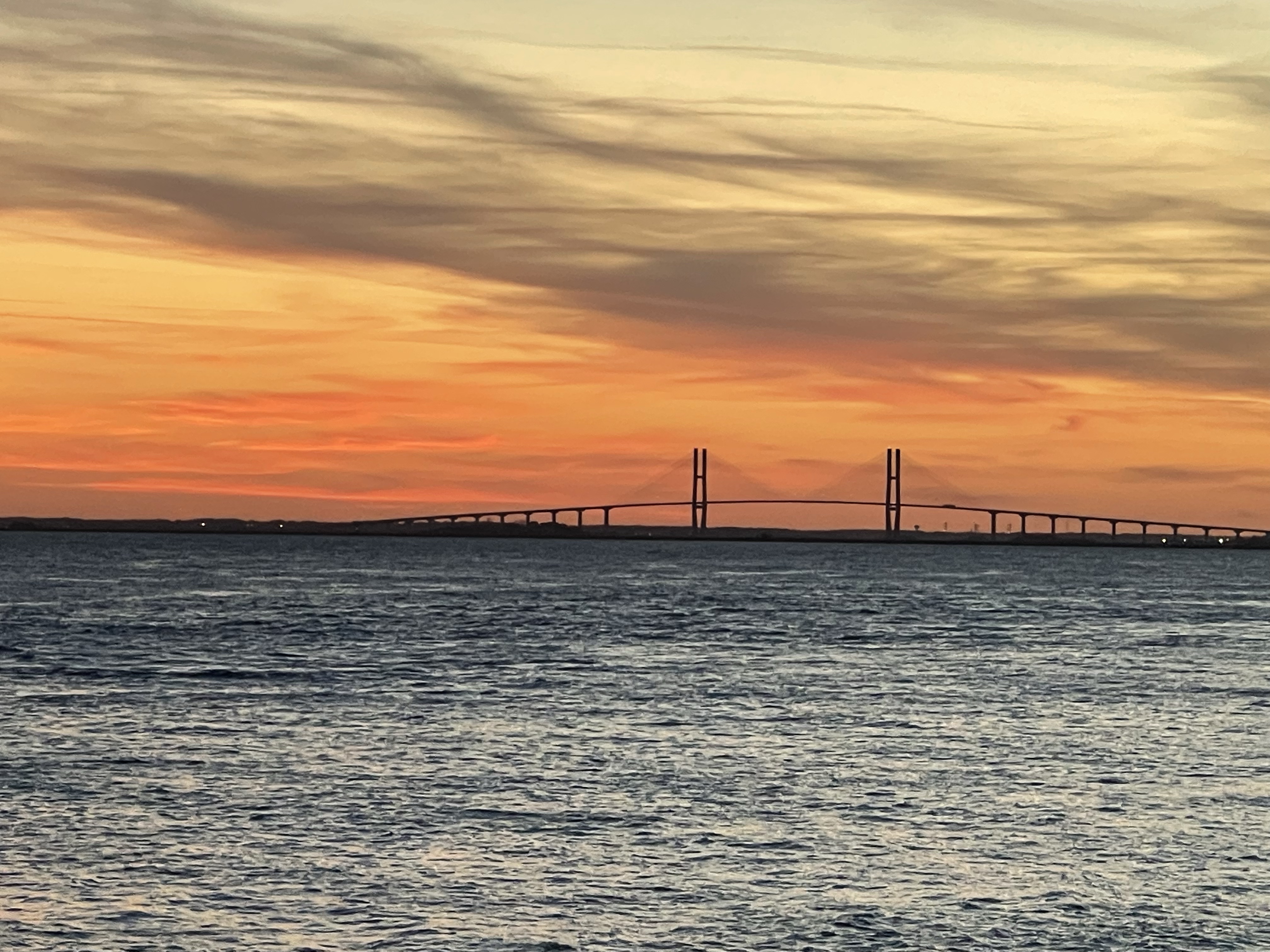 From the pier, the Sidney Lanier Bridge was beautiful framed by the sunset.