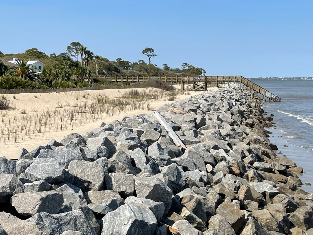 There is a beach access just off the beach bike path just a short ways from Captain Wylly Road. The beach access is a boardwalk and then steps. In other places, the beach access have ramps.