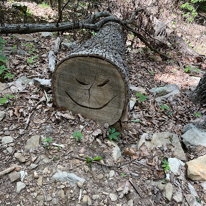 The trail past the dried creek bed was mostly flat for a while. Then it started up. It was a very long ramp to get to the top of the mountain. We ran into Jack Skellington carved into one of the logs. We saw this in many logs that had been cut so trees weren’t blocking the path.
