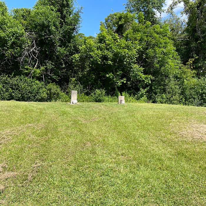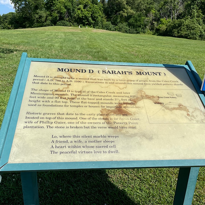 Station 3 is Mound D is much newer and built by the Coles Creek culture. It was built between 700-1100 AD. It is built on top of one Ridge 2 of the Poverty Point culture (1700-1100 BC). It has the graves of two women who lived in the area when the property was known as Poverty Point Plantation. They died in August of 1851. You can see their headstones.