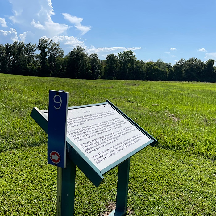 Station 9 was information about Mound E. The purpose of Mound E is unknown; no evidence of houses or other activities on or within the mound have been found. Archaeologists did find a piece of wood that radiocarbon dates the mound to sometime after 1500 BC. Archaeologists believe the mound was constructed during the early period of the Poverty Point culture.