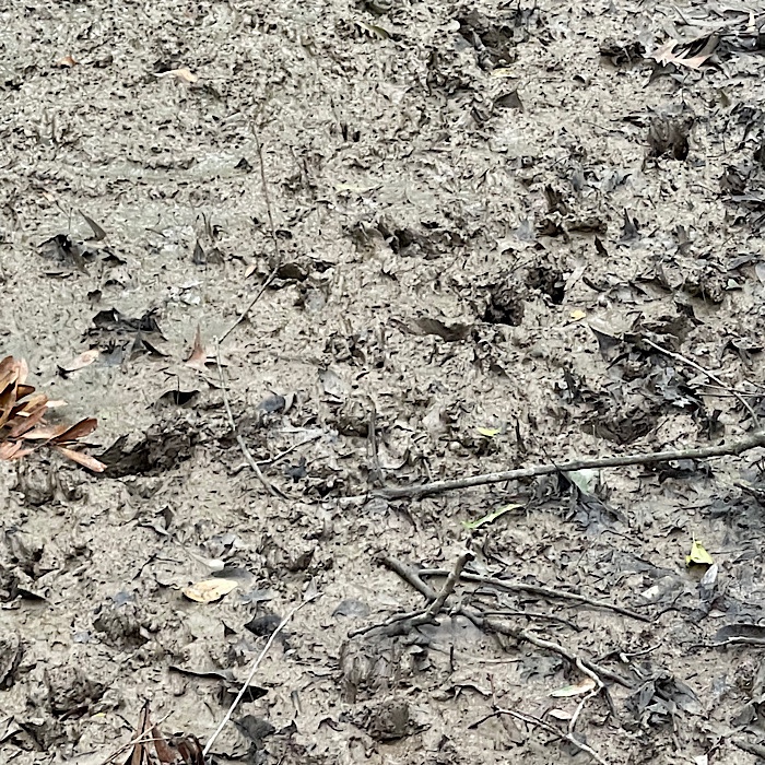 We came to a bridge over a dip. On one side of the bridge was a mud hole with animal footprints.