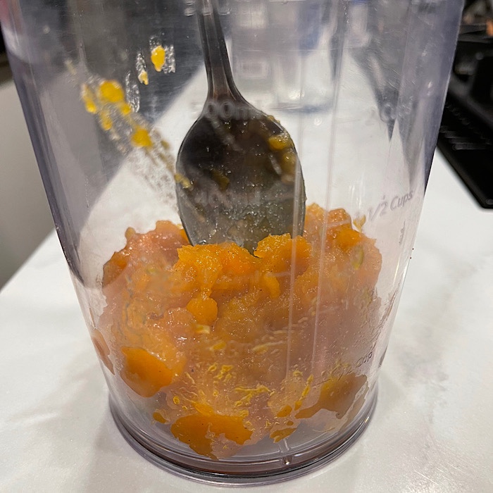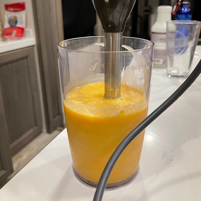 - In the blender or stick blender jar, add the sweet potatoes, lemon juice, and coconut milk. Run the blender until mixed.