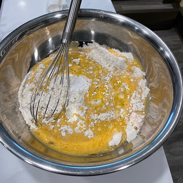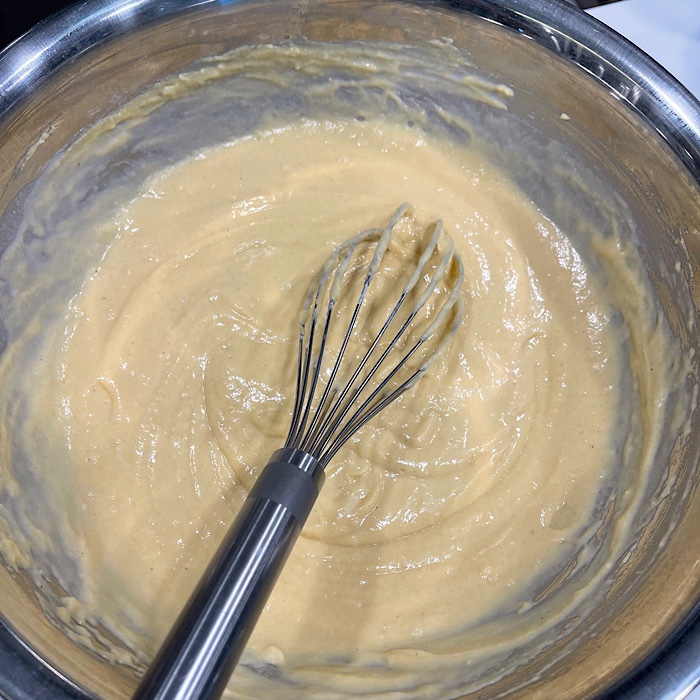 - Add the liquid from the blender to the flour mixture and whisk together.