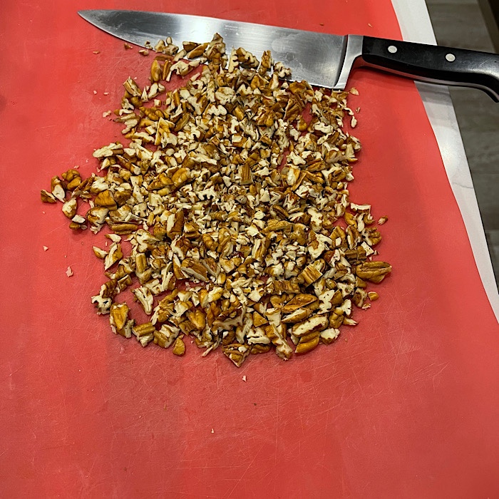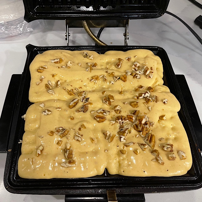 - When the waffle iron is hot, pour the waffle batter into the waffle iron based on your waffle iron instructions. Sprinkle pecans over the batter and close up the waffle iron.