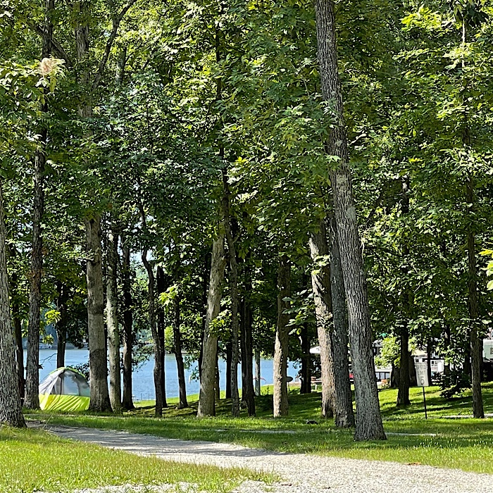 We were placed in an overflow site in the Lake Sara Campground on Friday, with the plan to move on Sunday. The overflow site has full hookups. It is at a diagonal to two other sites and blocks them from being pull-throughs. The picture below of the overflow site is taken from the site we moved into.