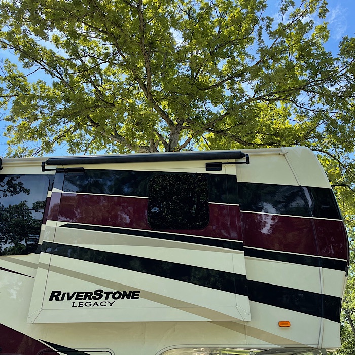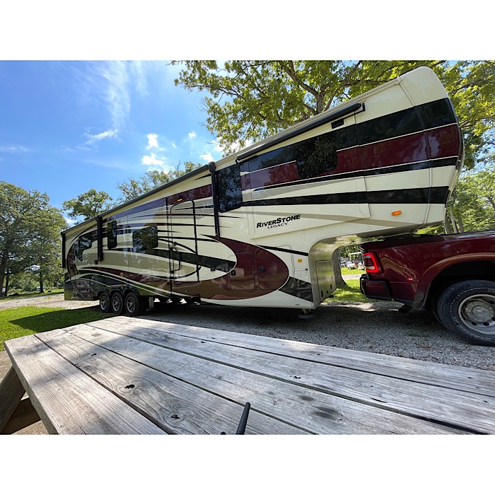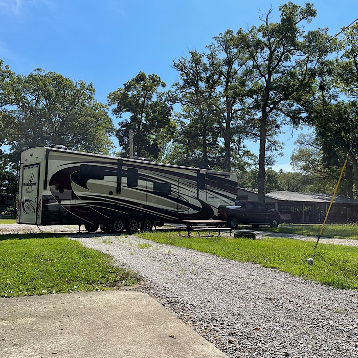 Bruce unhitched the truck from the RV and set up the RV. The pictures below show our new site with the RV just pulled in and then being set up.